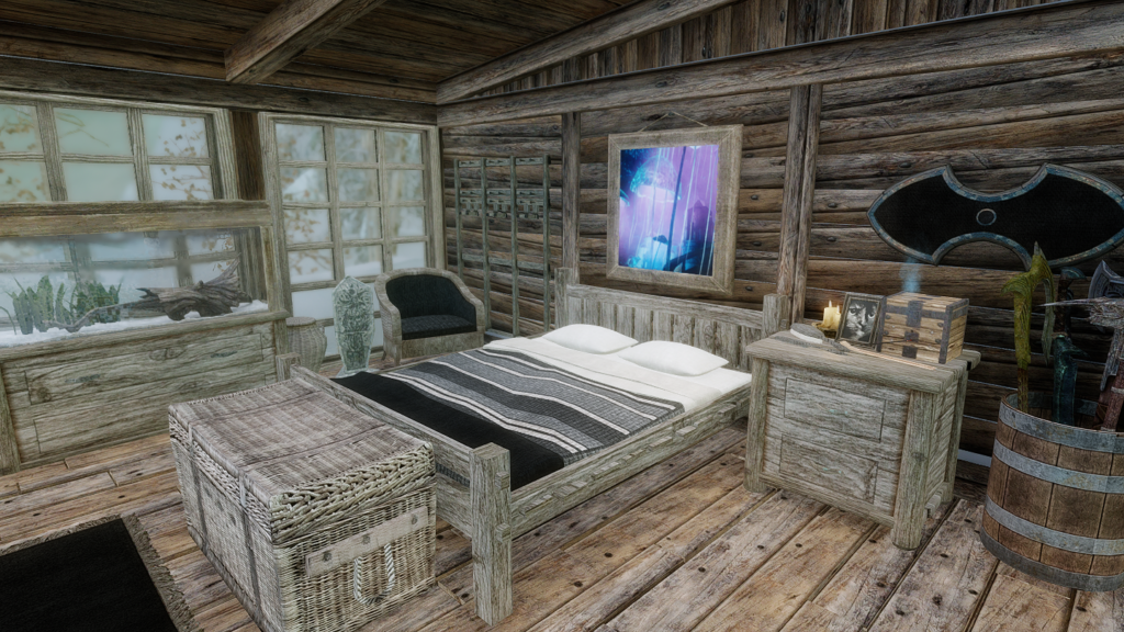 内風呂 | シャワー | 3~4人向け | 子供用ベッドあり | ウィンターホールド | 即入居OK | 日本語翻訳あり | クリスマスウィンターホールド地方・雪帳の聖域近くに、かつて狩人の一家が住んでいたという設定の家を追加するMODです。屋内にはお風呂や子供用ベッド、飾り付けができるツリーなどがあります。 -