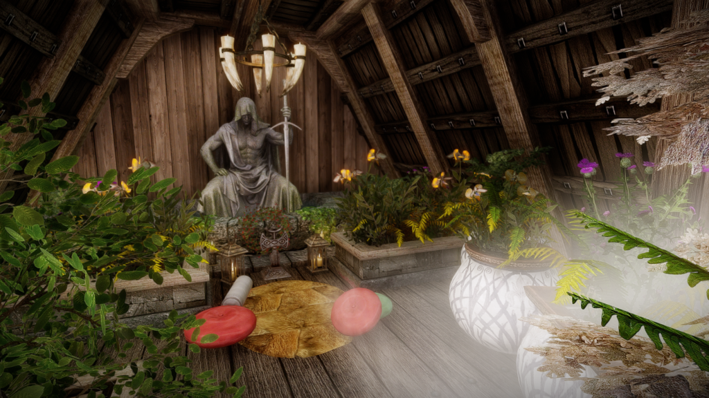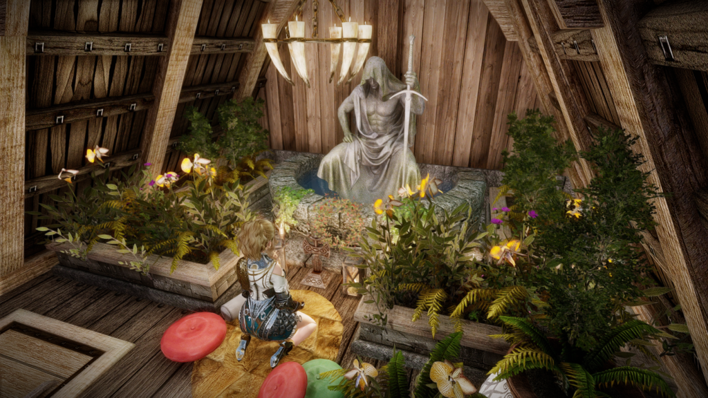 ソブンガルデの音楽や植物と共に、タロスの像や祠がひっそり祀られています。また、それらの前でアクティベートすることで瞑想のポーズを取ることができます。