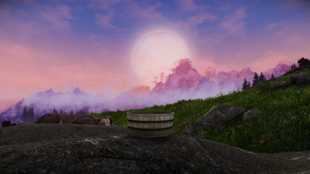 ロリクステッドから西に進み、モルダリング遺跡や大蛇の崖要塞がある辺りの景色が個人的には好きなので、そこで多めに撮影してみました。この辺りはホワイトラン方面の開けた草原や、世界のノド~リーチの山々の景色が楽しめる場所になっています。