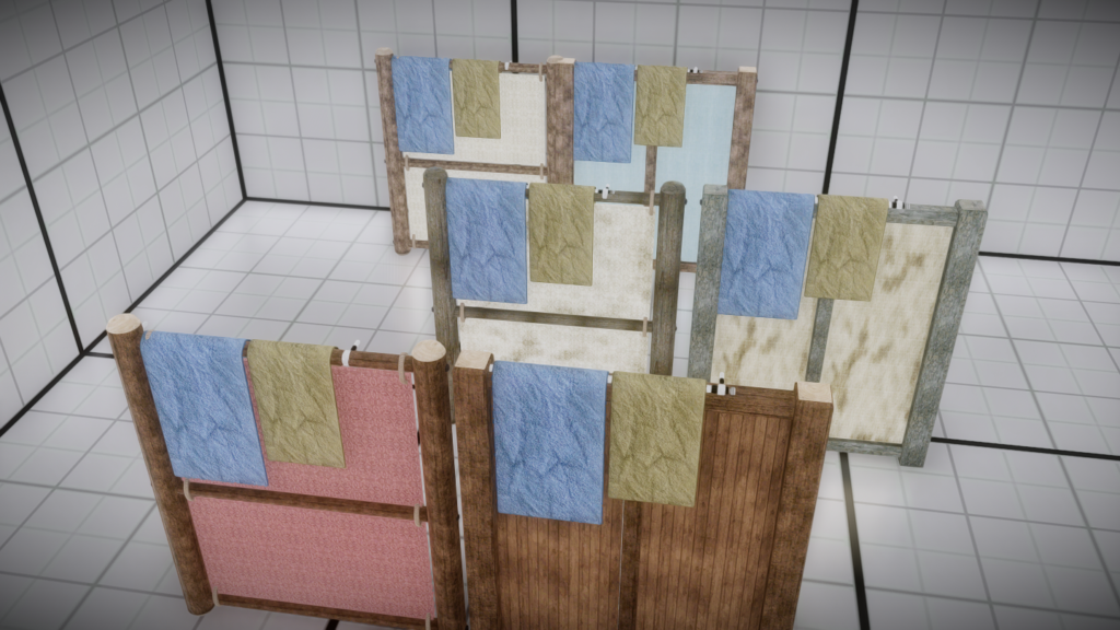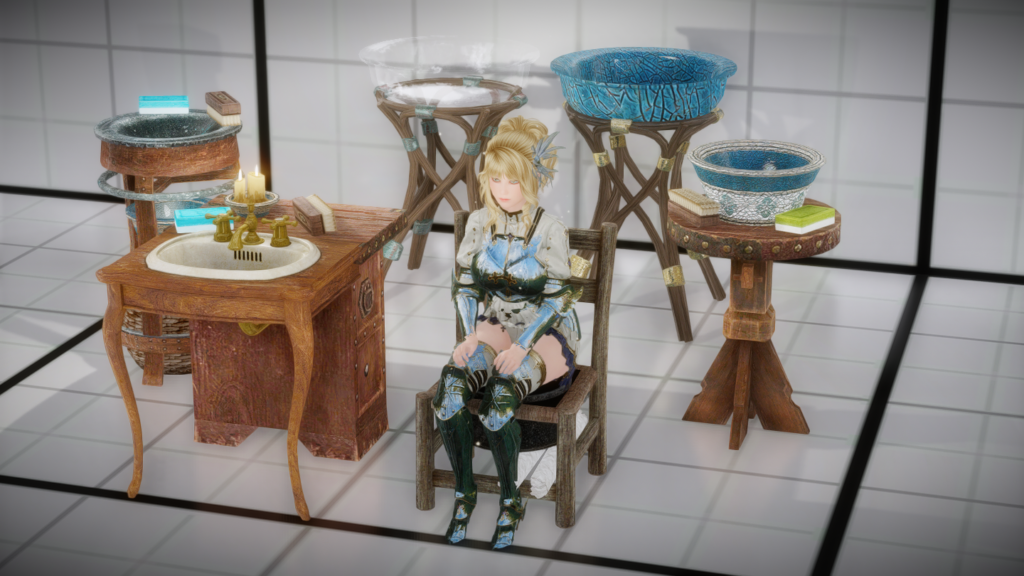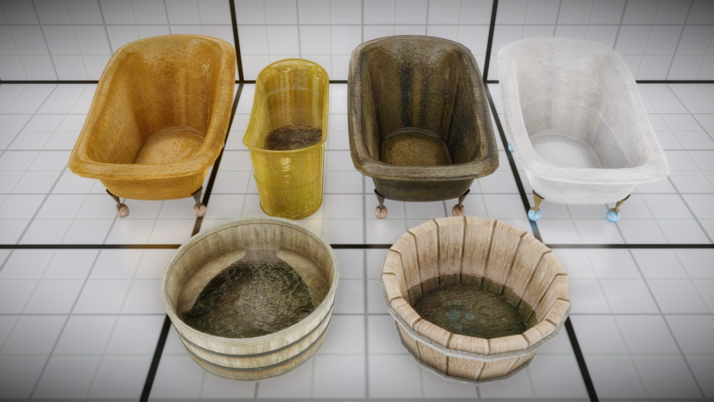 バスタブタイプと桶タイプのものを合わせて全6種類あります。ドワーフの浴槽(奥側の左から2番目)の作成には「ドワーフの鍛造術」のPerkが必要です。