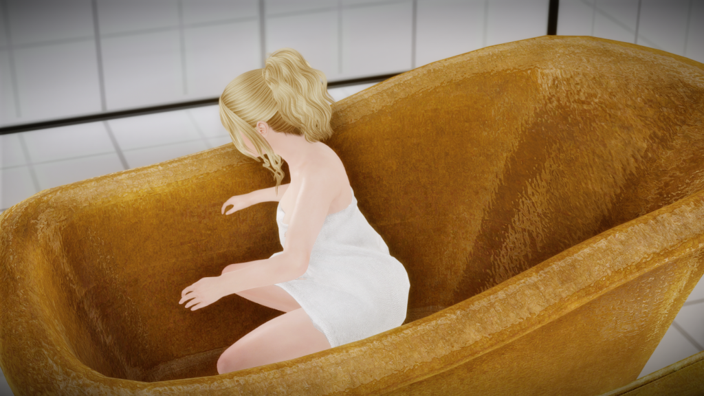 浴槽の中で、アニメーション付きで身体を洗うことができます。この際に石鹸を使用するかどうか選べます。石鹸を使用しない(手持ちにない)場合もアニメーションが再生されます。