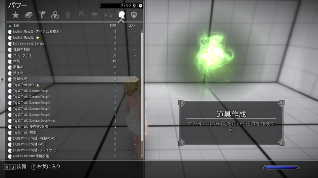 キャンプMODで追加されたパワー「道具作成」を使用し、アイテムを作成します。このMODで作れるアイテムはその他欄に表示されます。