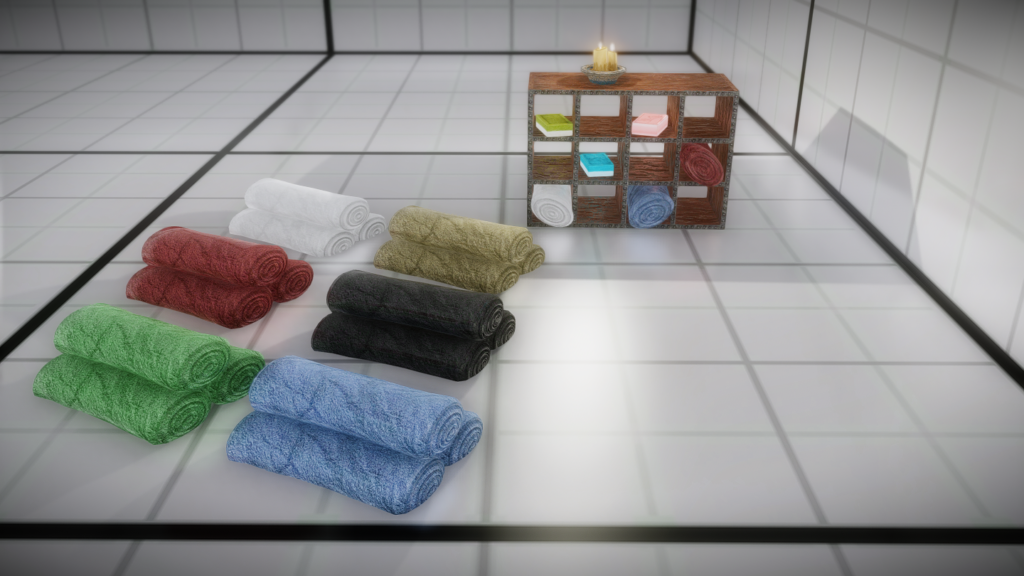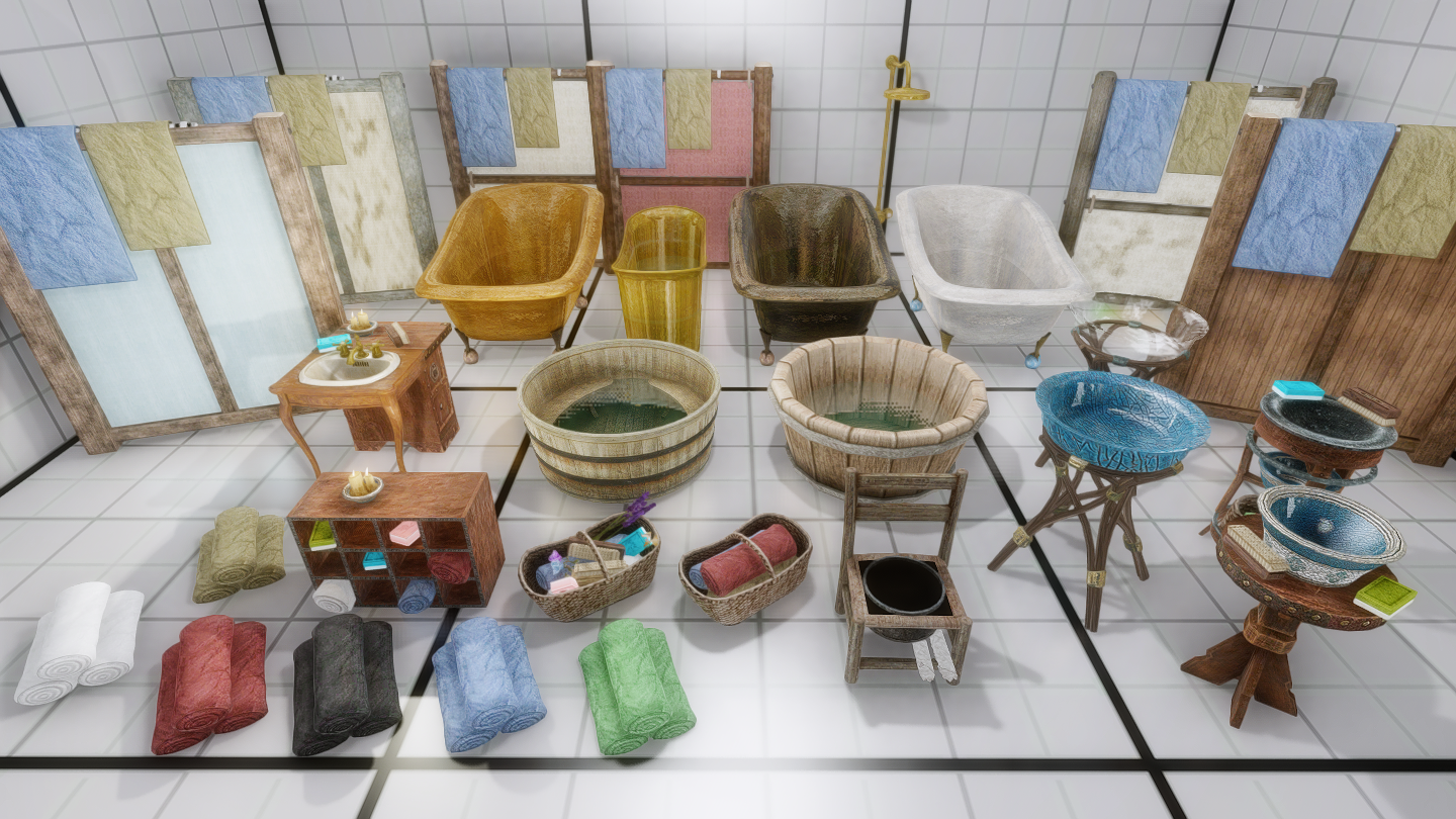 石鹸・浴槽・洗面台(シンクやトイレ含む)・シャワー・仕切り板・かご・タオルラック(タオル)が追加されます。