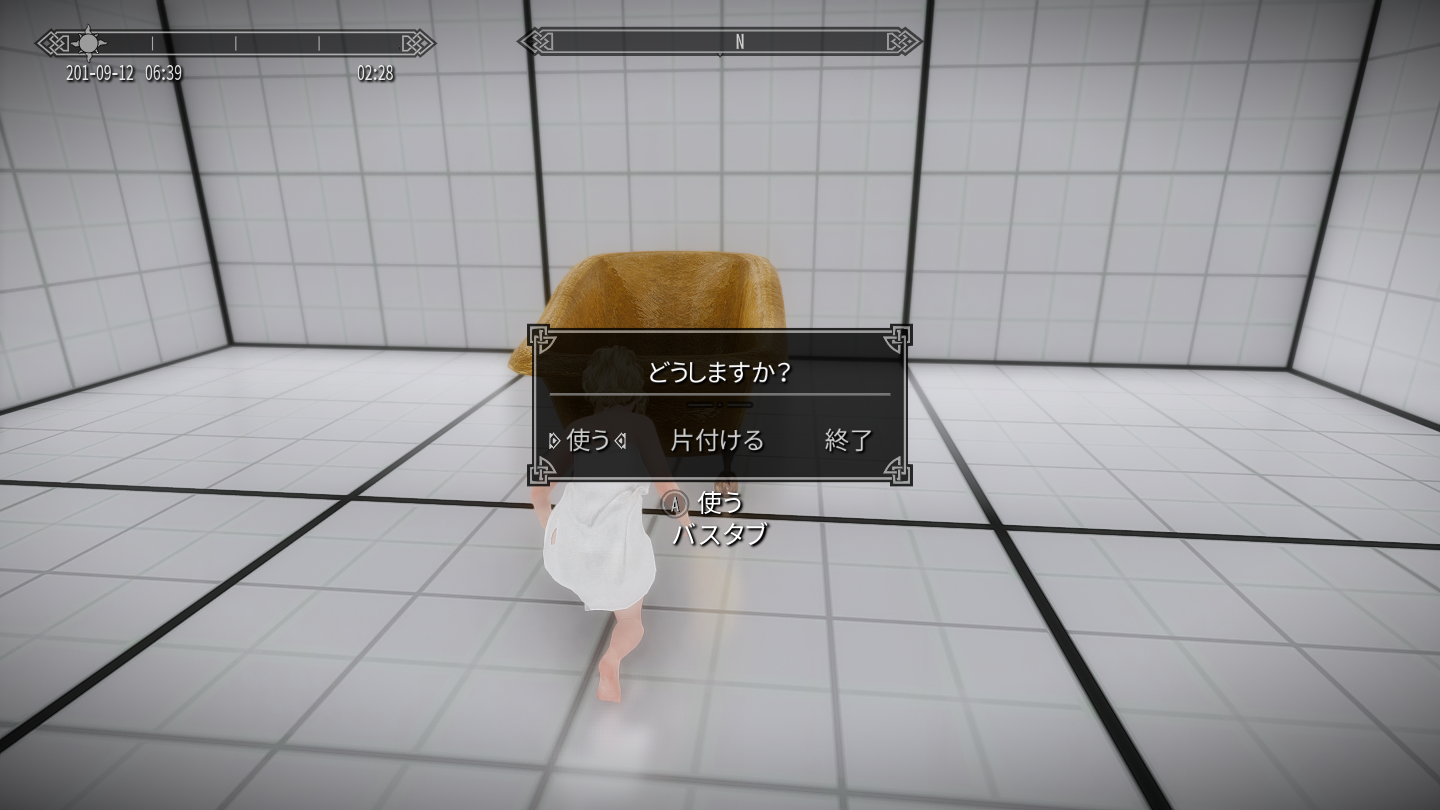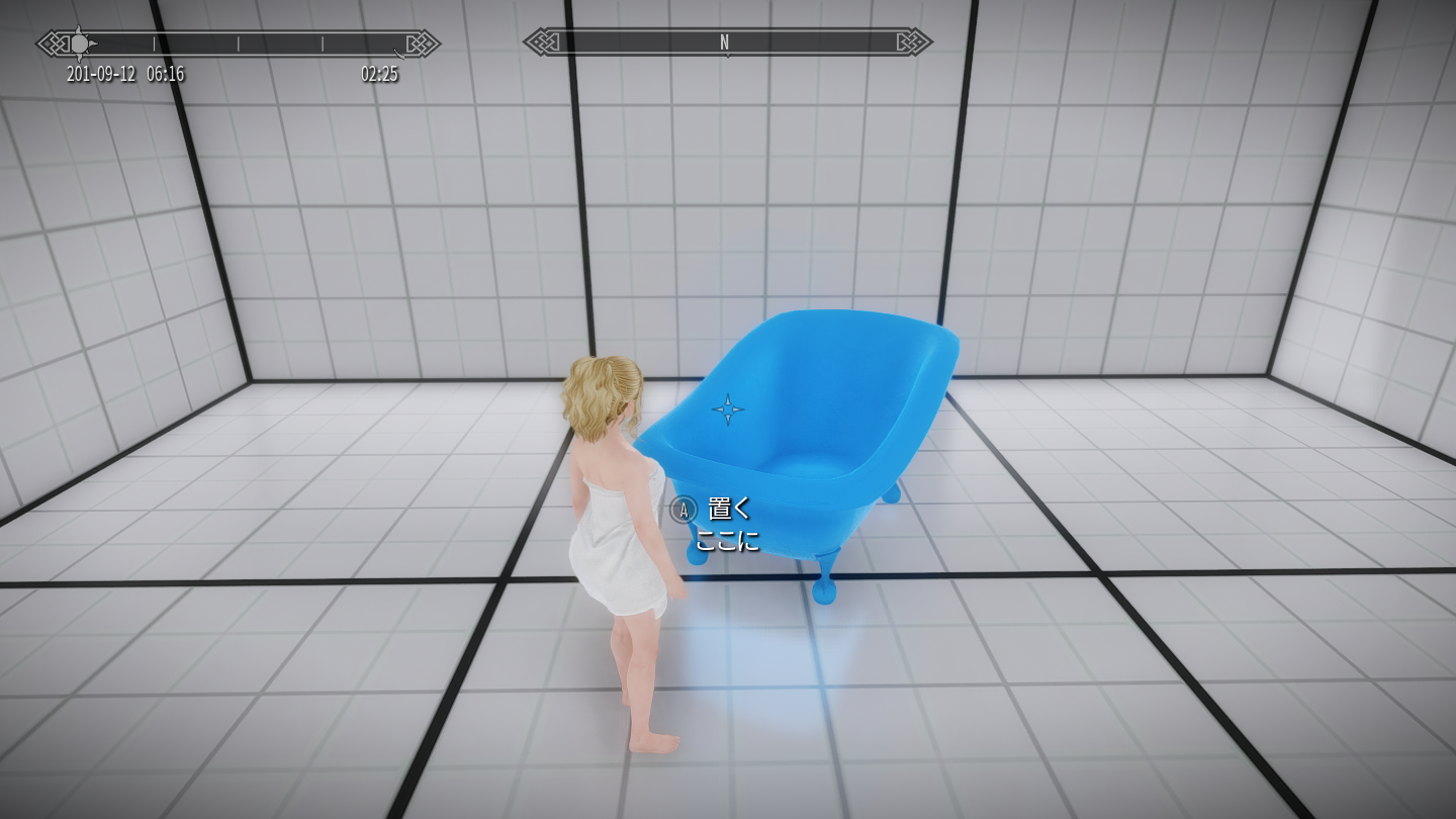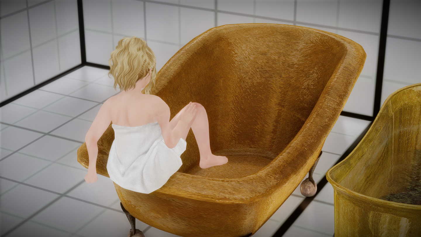 浴槽の中で、アニメーション付きで身体を洗うことができます。この際に石鹸を使用するかどうか選べます。石鹸を使用しない(手持ちにない)場合もアニメーションが再生されます。