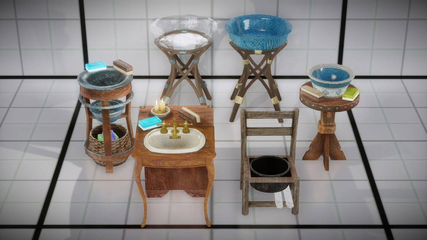 バスタブタイプと桶タイプのものを合わせて全6種類あります。ドワーフの浴槽(奥側の左から2番目)の作成には「ドワーフの鍛造術」のPerkが必要です。