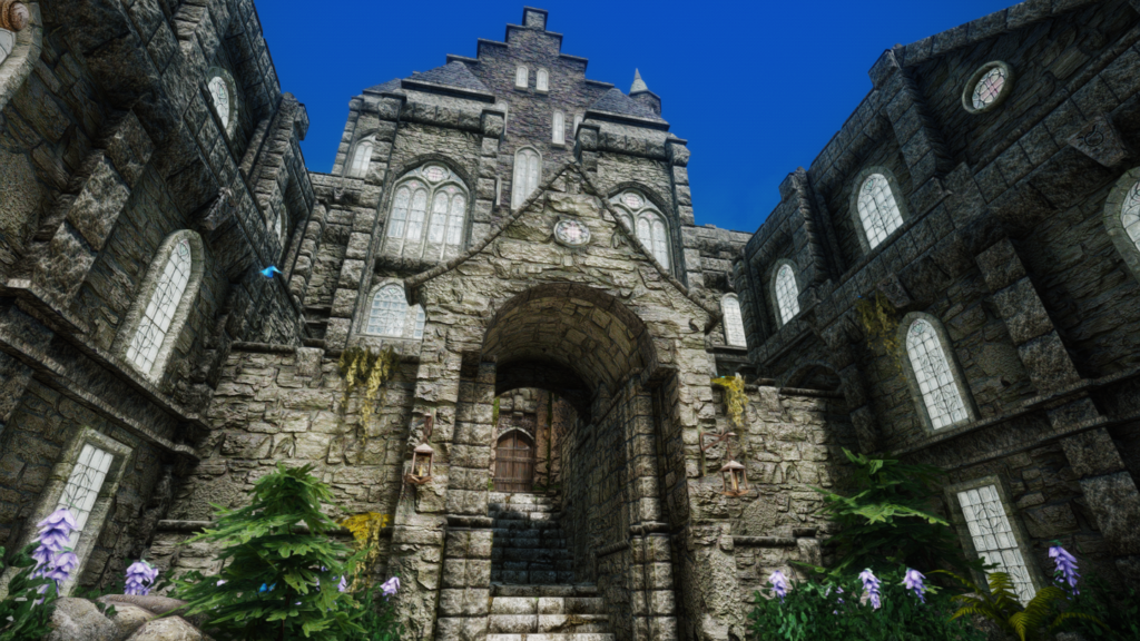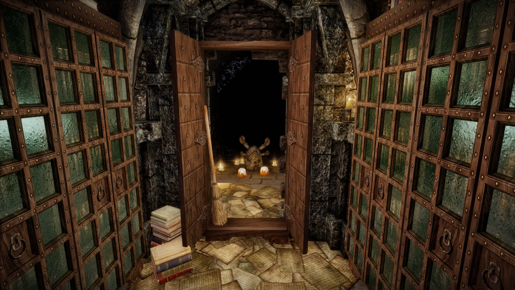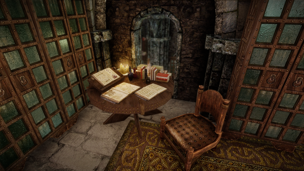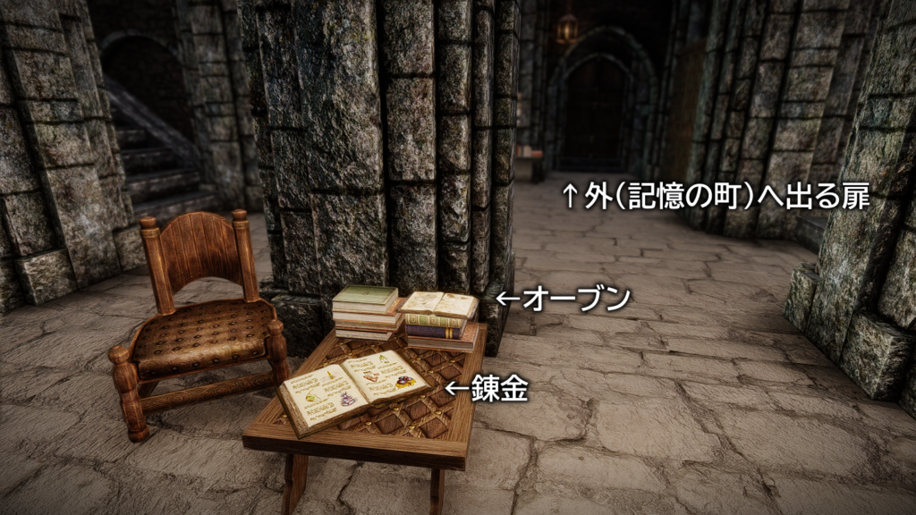 入口を正面にして左側にあるベンチに、この世界へテレポートすることができる呪文の書があります。記憶の町やスカイリムでこのテレポート魔法を使うとブックワーム(屋内)へ、ブックワーム内で使うと記憶の町へ転移します。