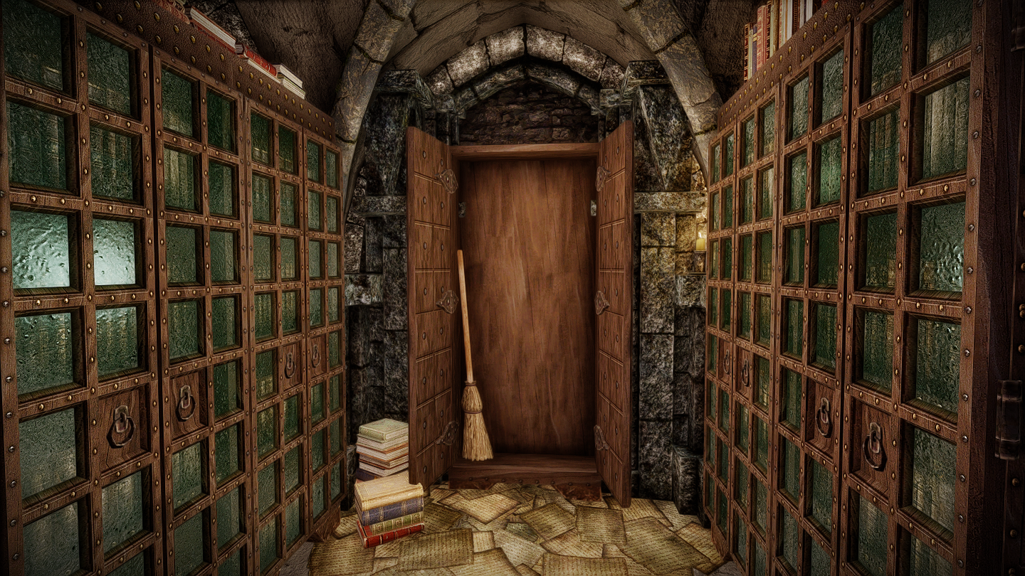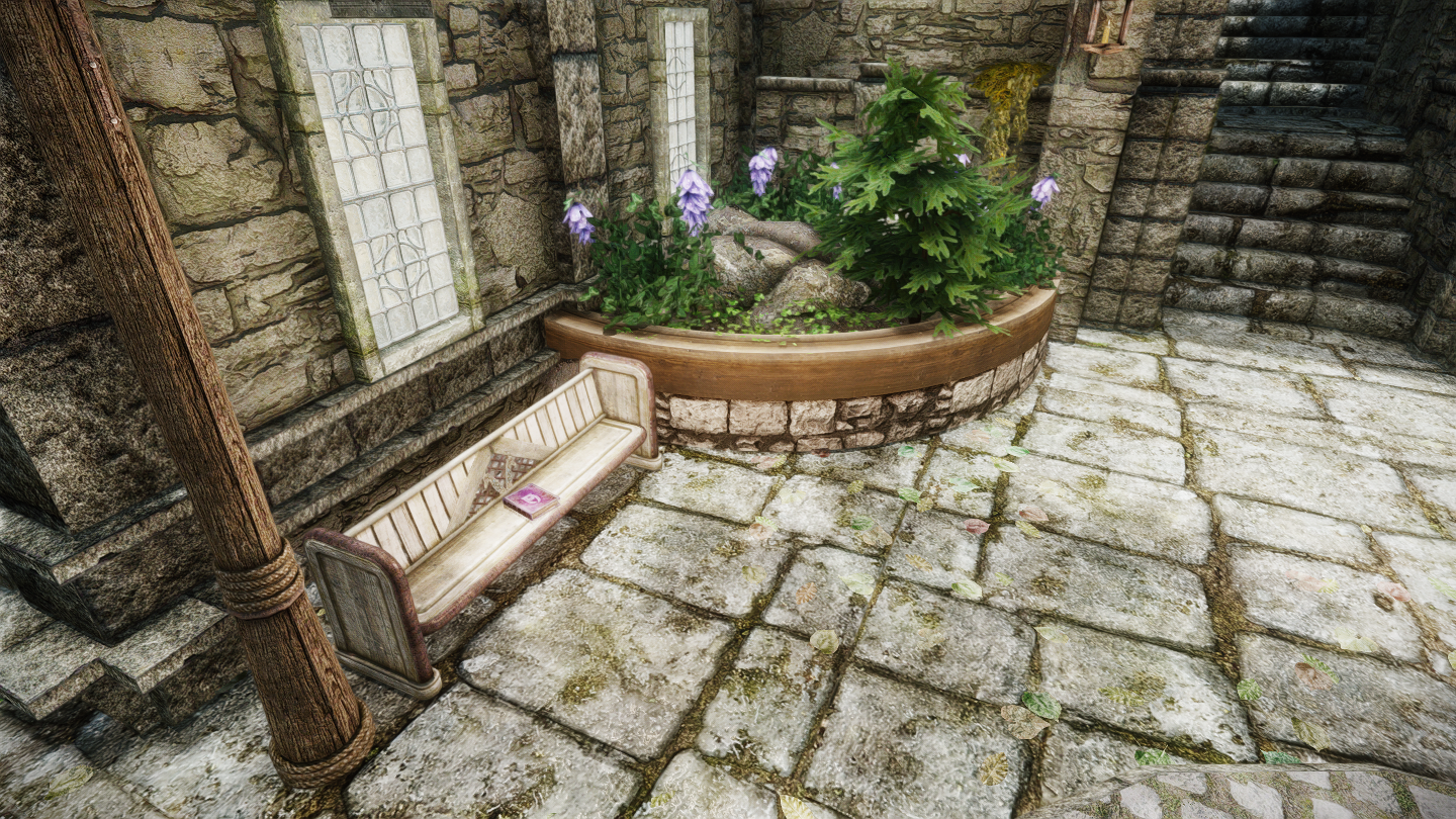 入口を正面にして左側にあるベンチに、この世界へテレポートすることができる呪文の書があります。記憶の町やスカイリムでこのテレポート魔法を使うとブックワーム(屋内)へ、ブックワーム内で使うと記憶の町へ転移します。