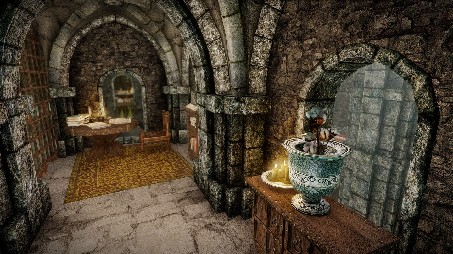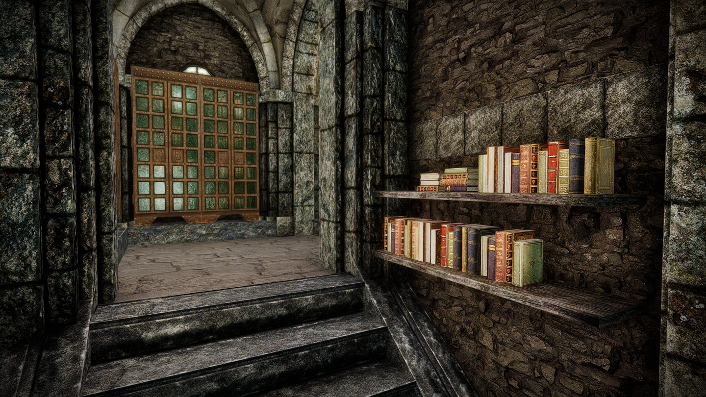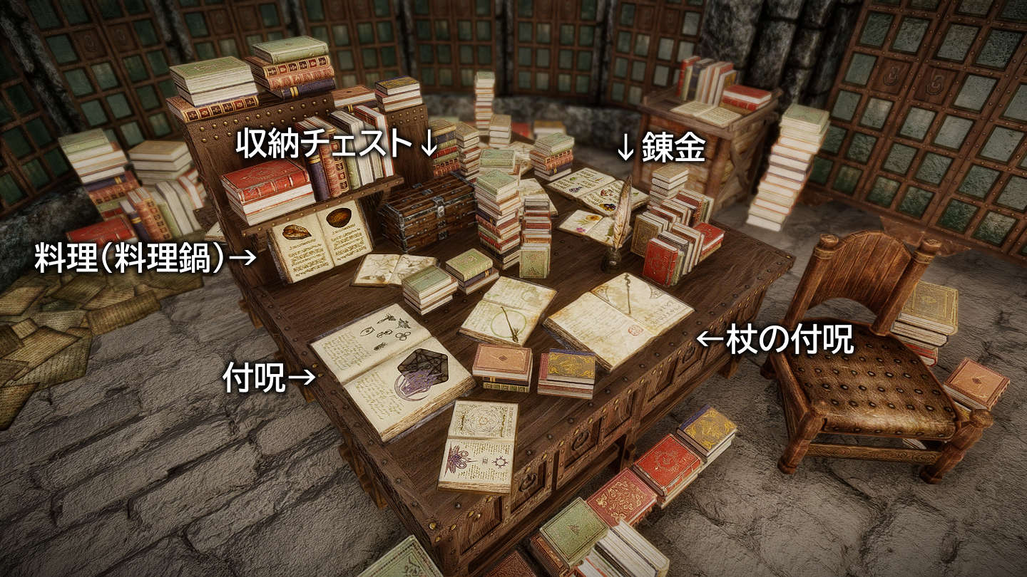 本(プレイヤーがゲーム内で読める書籍)はそれぞれ書棚に納められています。図書館やウィンターホールド大学のアルケイナエウムに近い感じでしょうか。