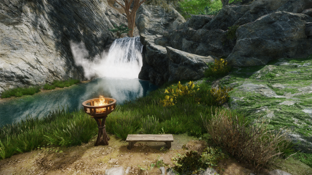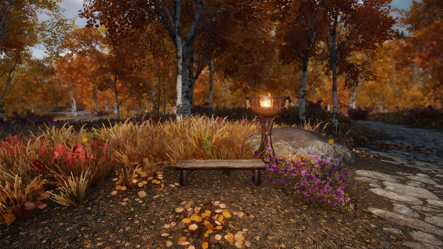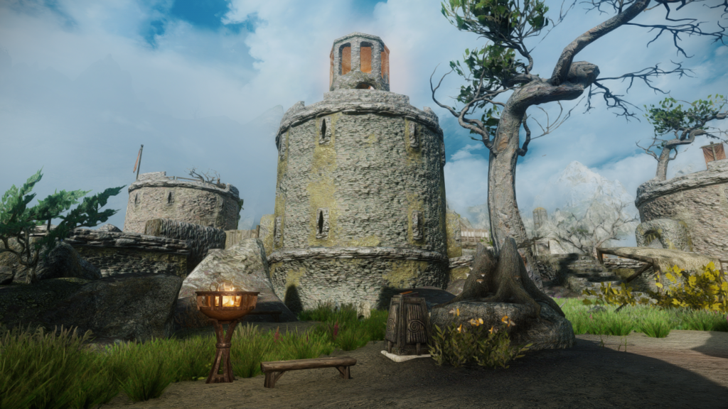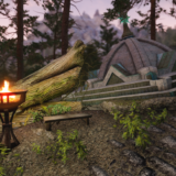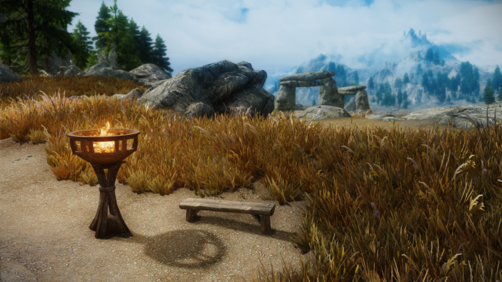 停留所としてかがり火とベンチが設置されます。ベンチをアクティベートし、目的地を選択すると移動する仕組みです。 オブジェクトを移動するMODなどを導入していれば位置を調節することもできます。