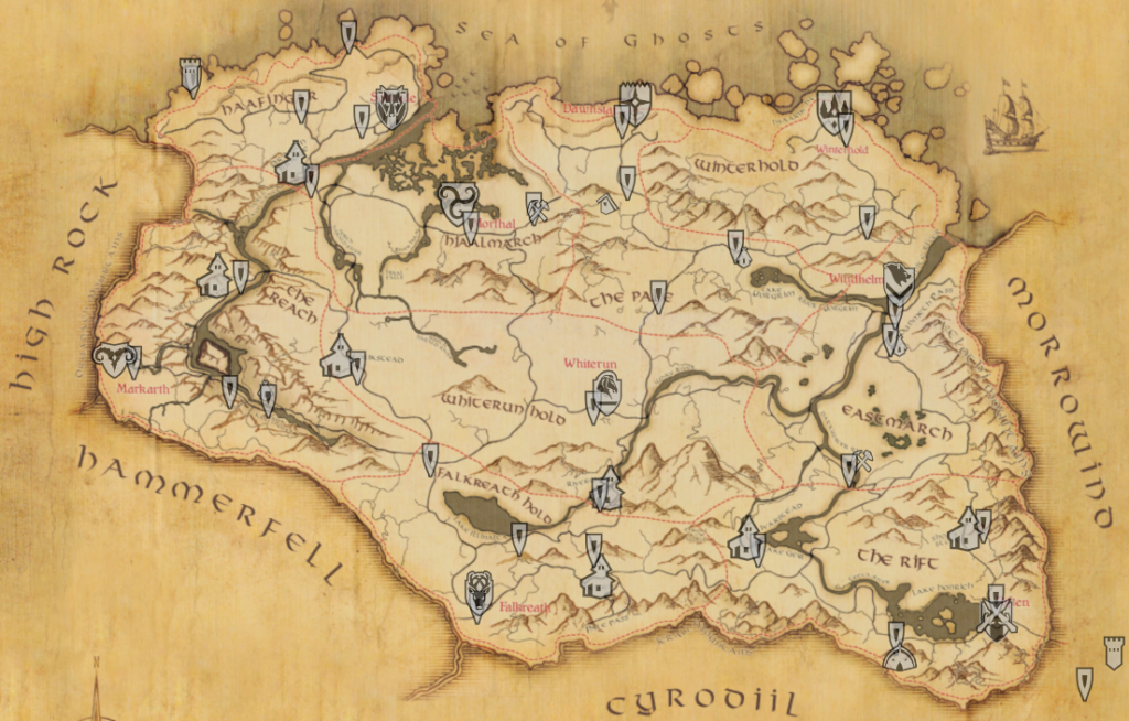 5つの都市と15の村・集落、Heathfireで建築できる3つの家、その他9箇所のロケーション付近に停車します。下向きの三角形が停留所のマップマーカーです。