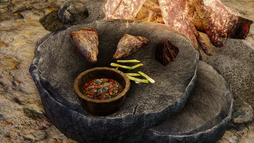近くには錬金器具(乳棒と乳鉢)や料理鍋、前の族長が置いていった日記も置かれています。