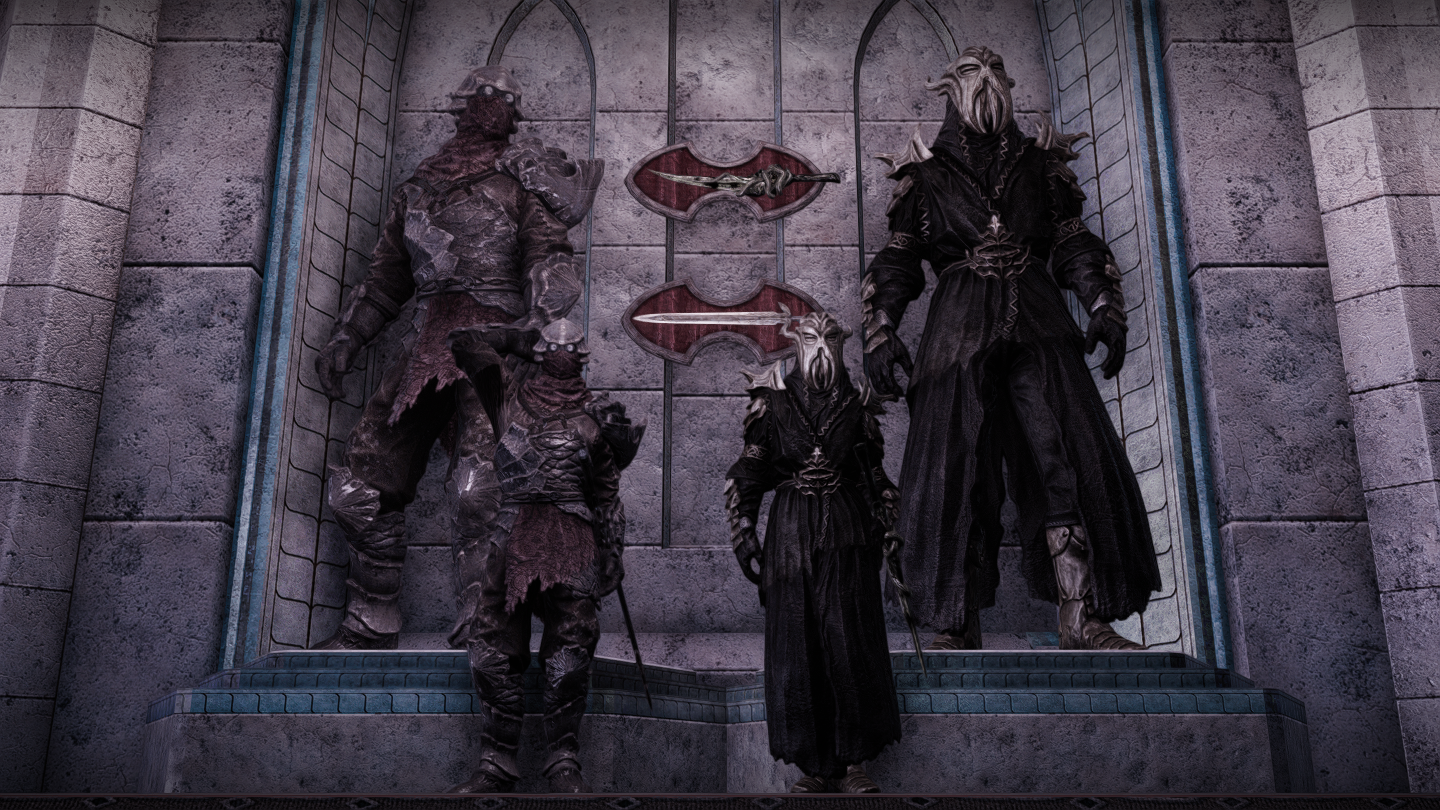 マネキンがかなりたくさん並んでいたので、フルフェイス装備が特徴的な衛兵やミラークさんたちの装備をご本人と一緒に並べてみました。マネキンのポーズが変わっているのはご愛嬌ということで…