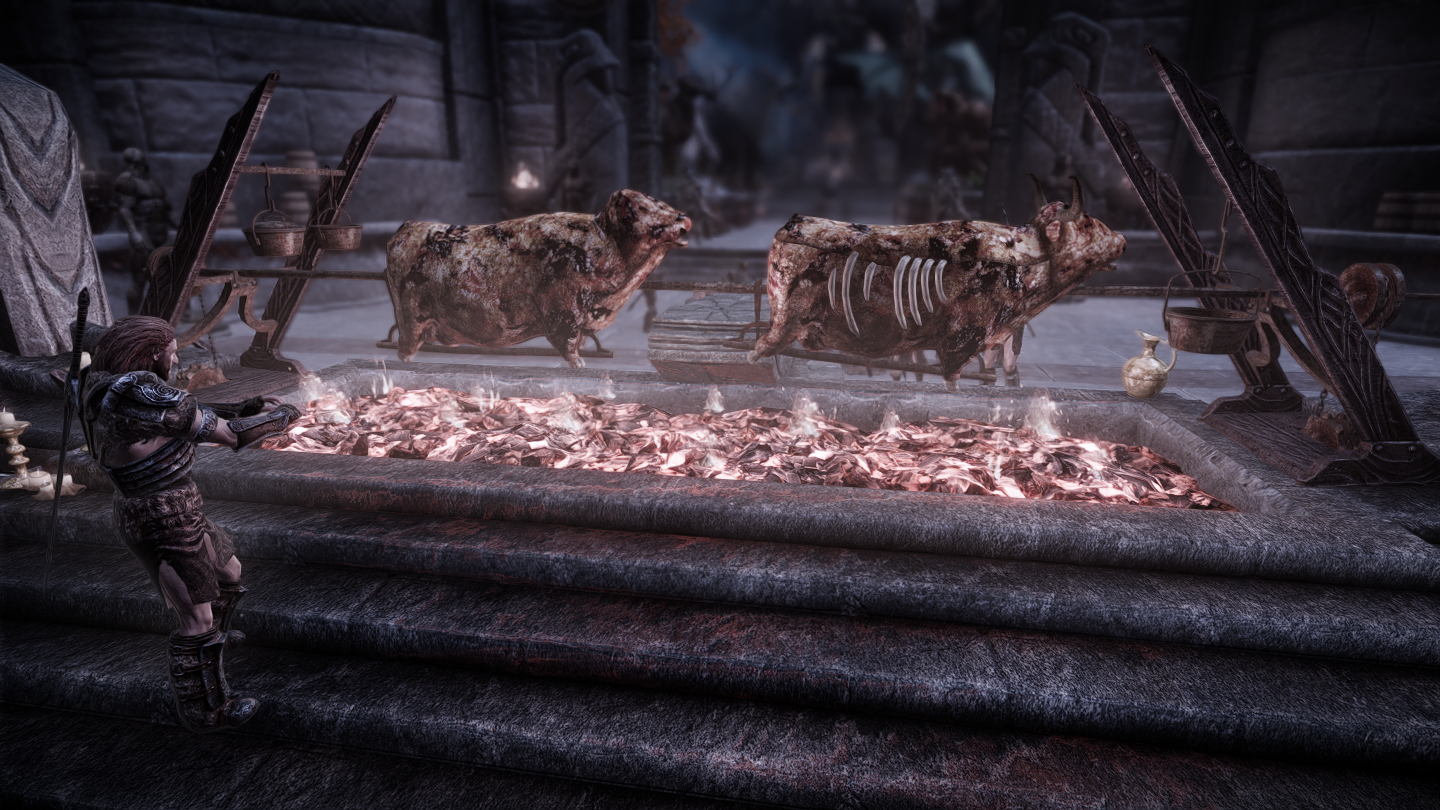 前庭から入ってすぐのところにある、ソブンガルデの英雄やどこかで見たことがある御方たちがわいわいしているエリアです。エリア中央の、雄牛のローストが焼かれているところに料理鍋があります。