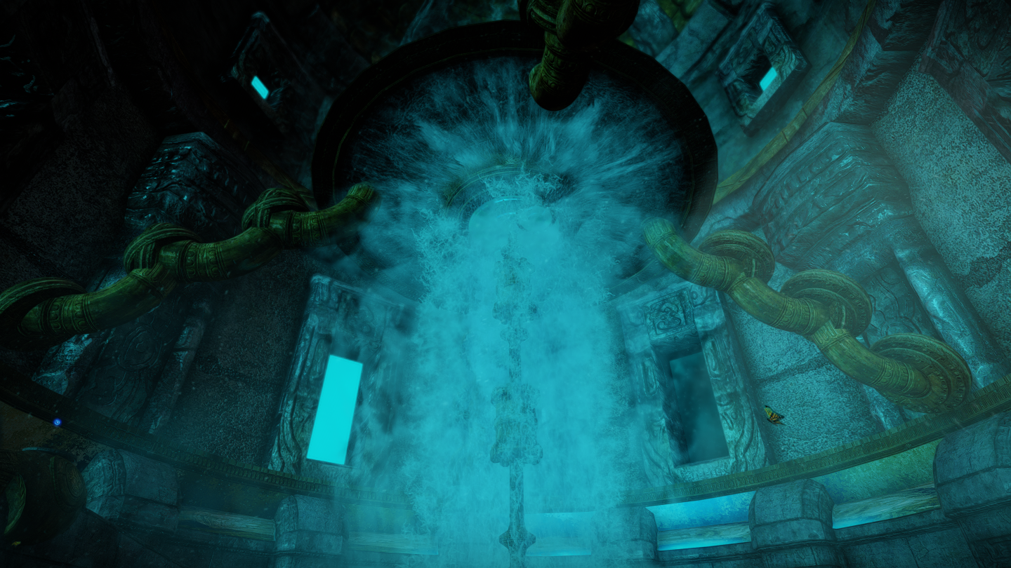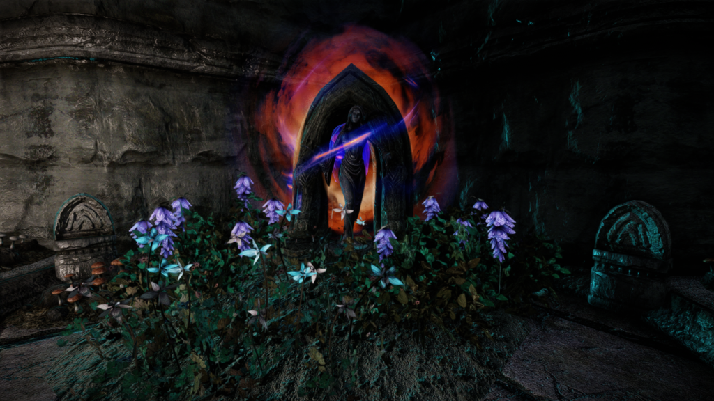 マグナスの目のようなオブジェクトの近く(画像1枚目)に、この建物へのテレポート呪文の書と、転移室へのテレポーターがあります。マグナスの目の手前の、小さな岩のようなものです。この小さなテレポーターは屋内の各所に配置されているので、探索する際は意識してみるといいかも。