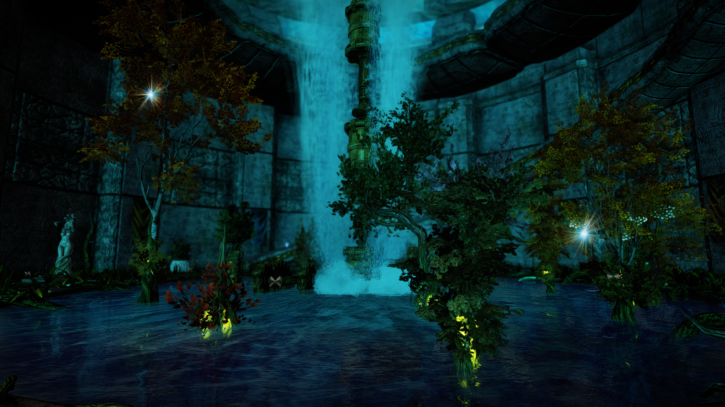 逆流している噴水が特徴の、どこか退廃的なエリアです。錬金素材が植えられたプランターやノクターナルの祠があります。