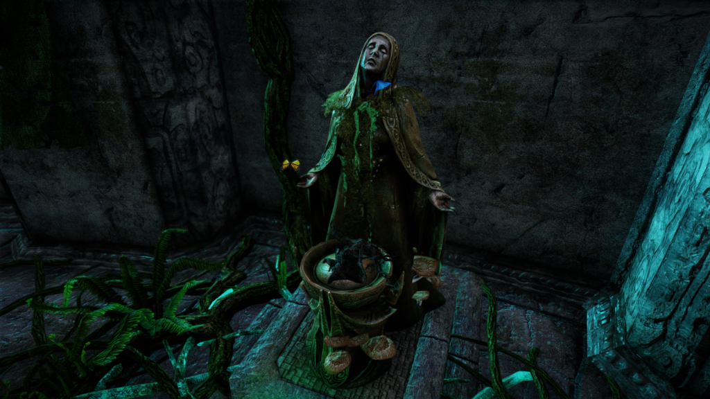 庭園の奥にはディベラの像や祠がひっそりと。また、近くにある扉からバルコニーに出ることができます。