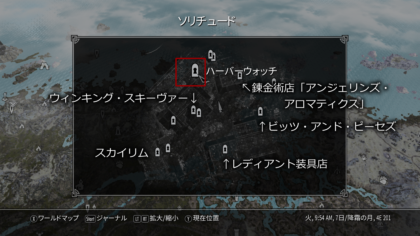 家はソリチュードの街中に建っています。正門から入って左側にある宿屋「ウィンキング・スキーヴァー」と錬金術店「アンジェリンズ・アロマティクス」の間です。