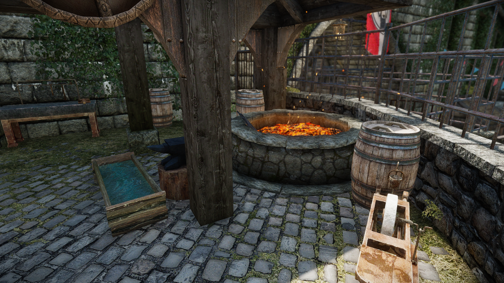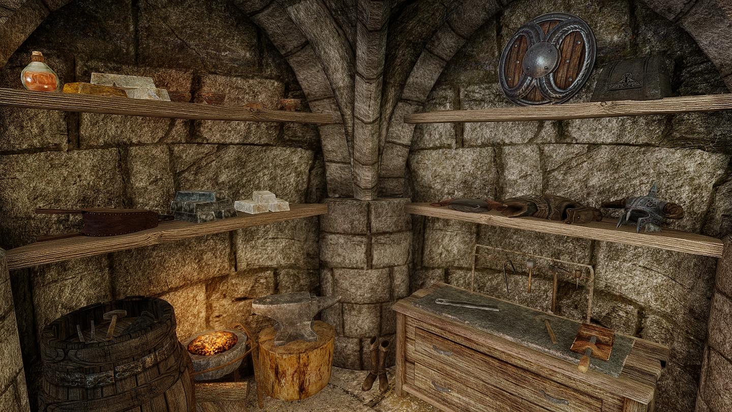 家のすぐそばには薪割り台が、少し歩いたところにある鍛冶屋には鋳造器具や砥石、作業台、皮なめしの棚などがあります。
