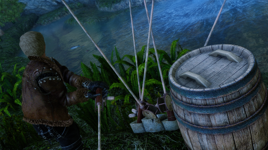 収納スペースが設置されている他、釣り竿の近くの樽には魚が入っていました。