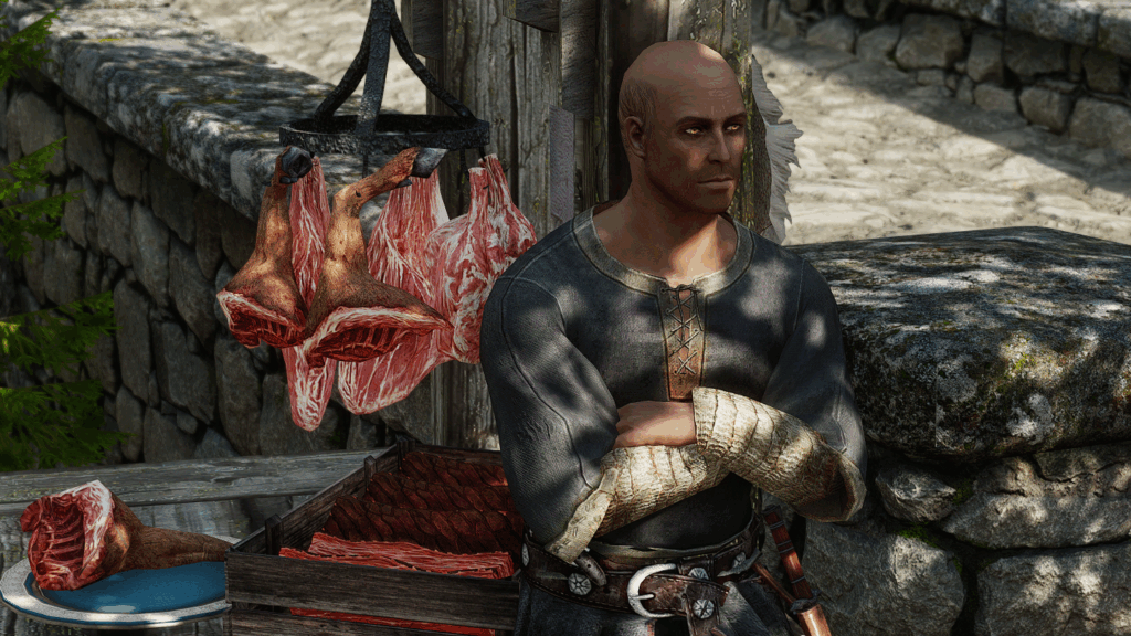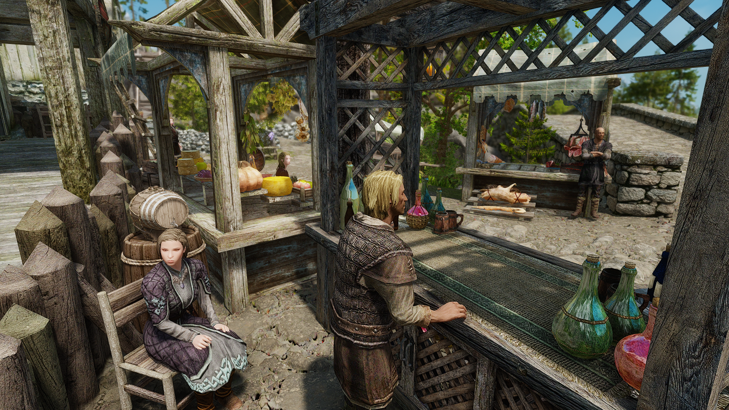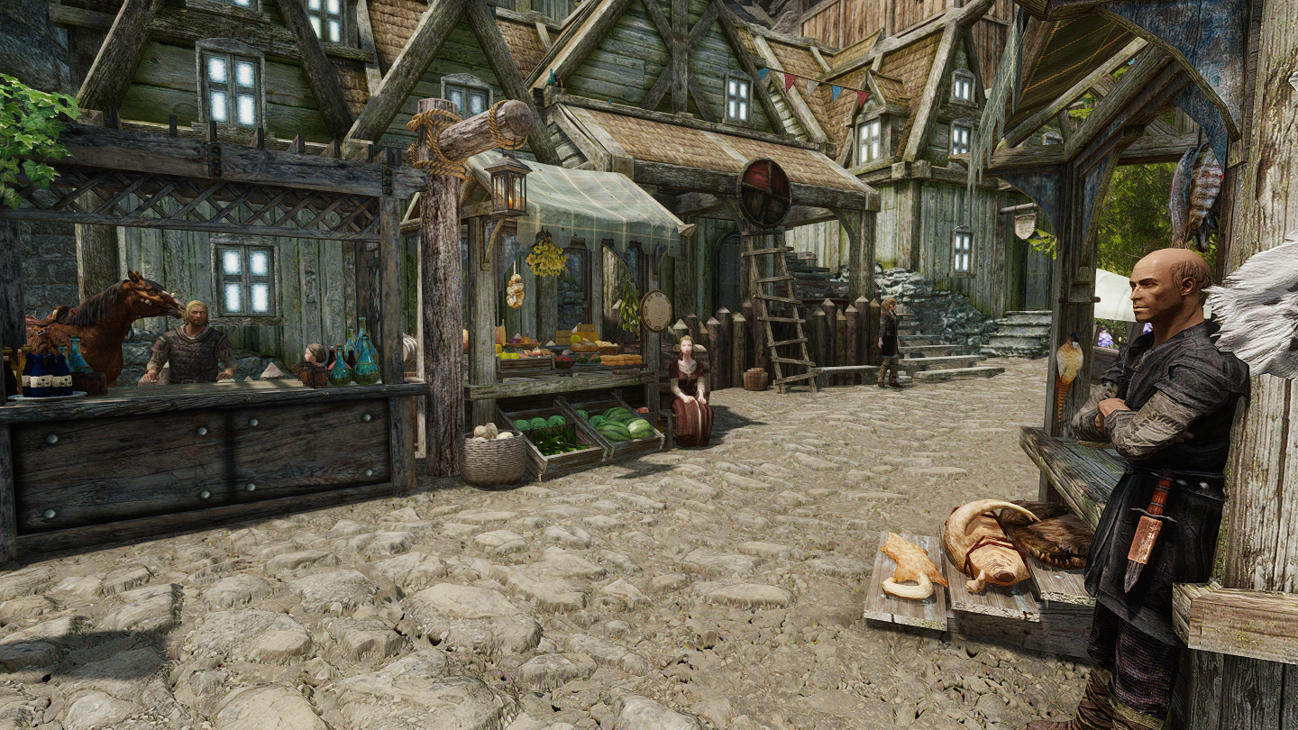 商人や衛兵、子供など、集落内に多数のNPCが生活しています。時間帯によって行動スケジュール(パッケージ)が組まれており、各々の仕事をしたり家で休んだりしています。