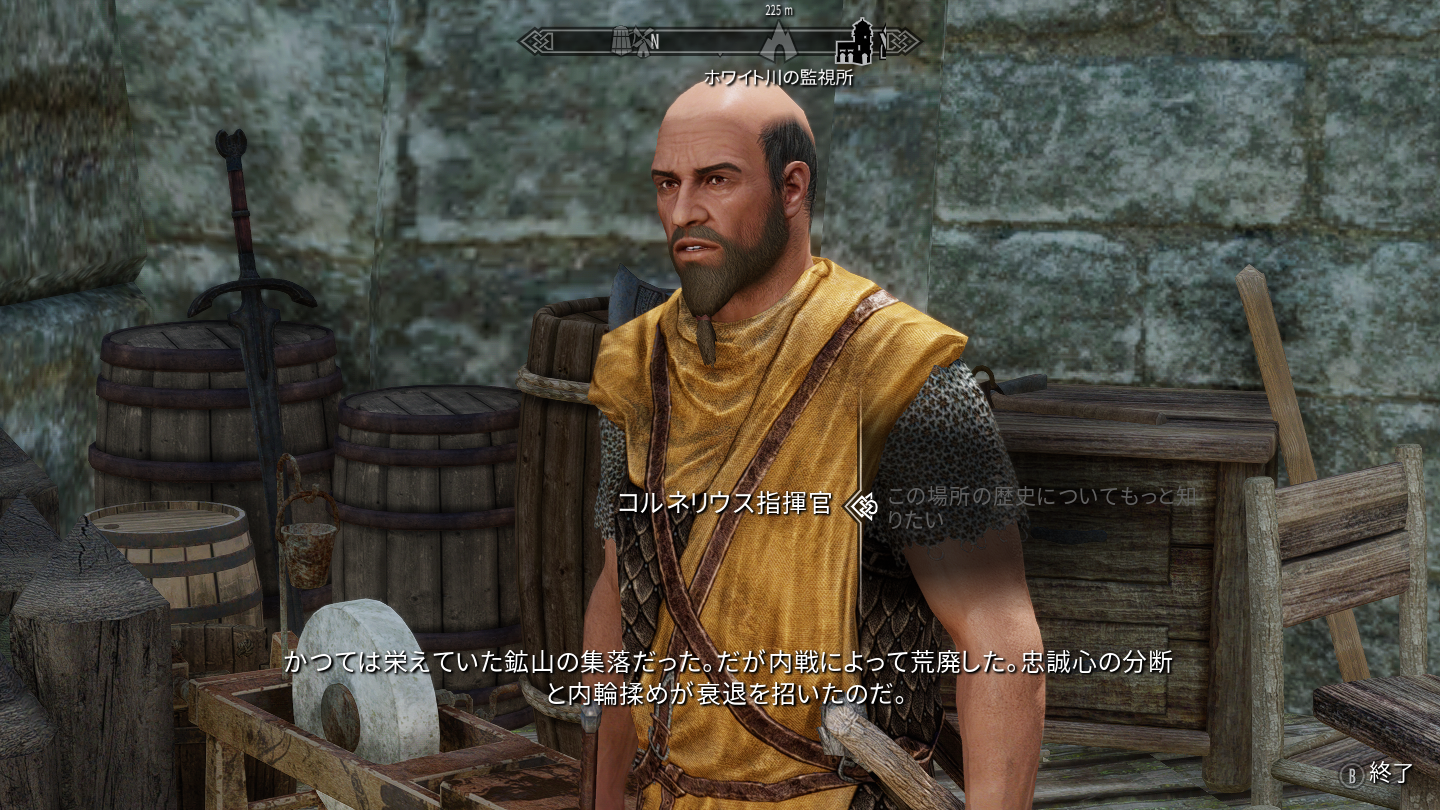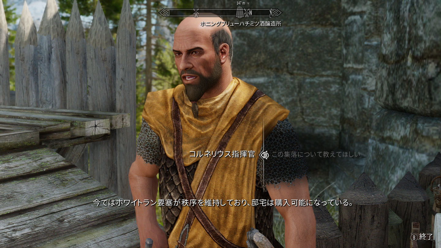 集落に着いたらまずコルネリウスという指揮官NPCに話しかけます。コルネリウス指揮官は渡ってきた橋の近くか、監視塔などにいると思います。