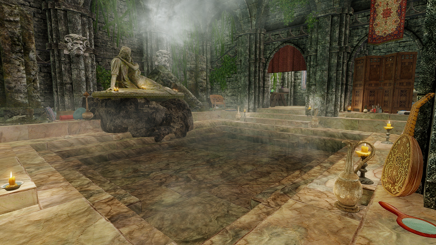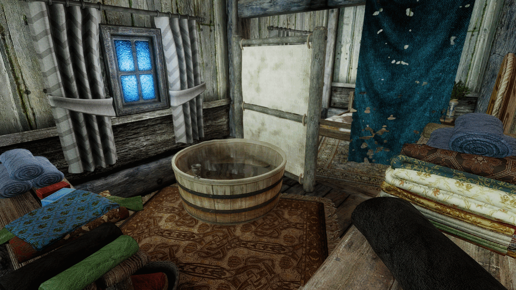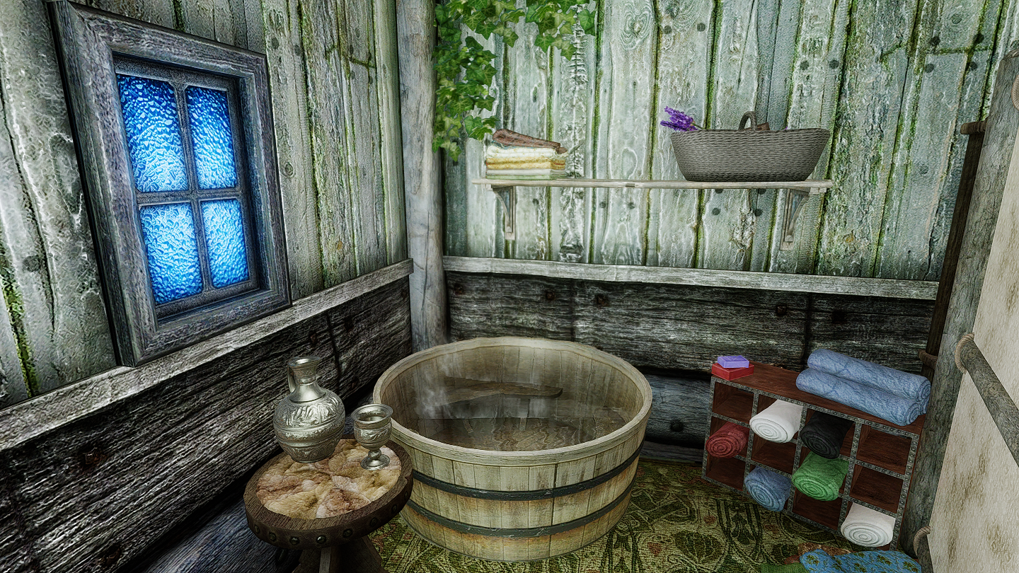 プレイヤーハウスの中に広い浴室があります。その他、NPCの家の中には浴槽が設置されているものもあります。