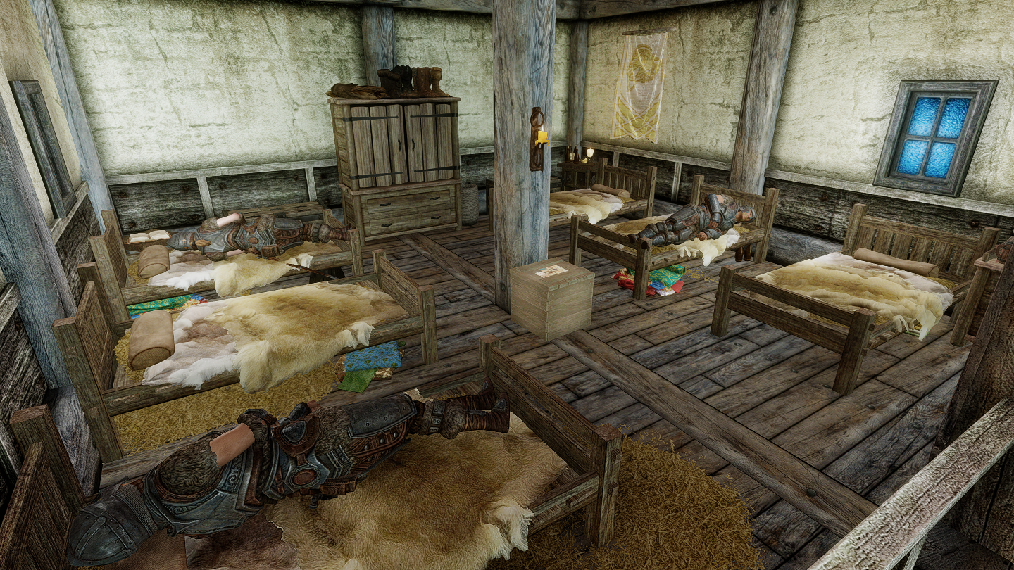 プレイヤーが雇用した衛兵たちが生活している宿舎です。管理人の家で私設衛兵を雇用した後に出入りできるようになります。