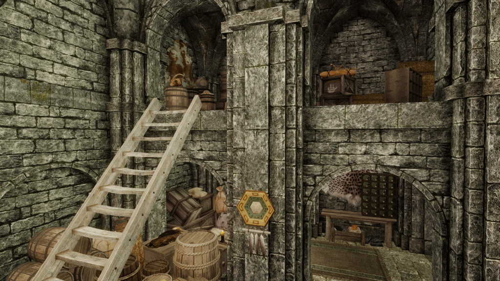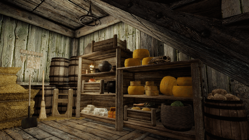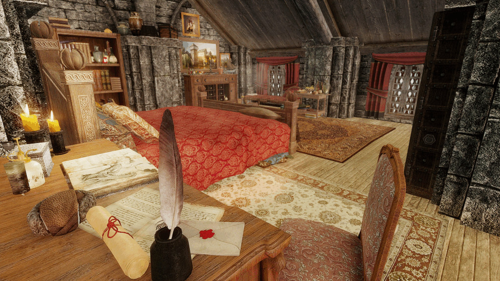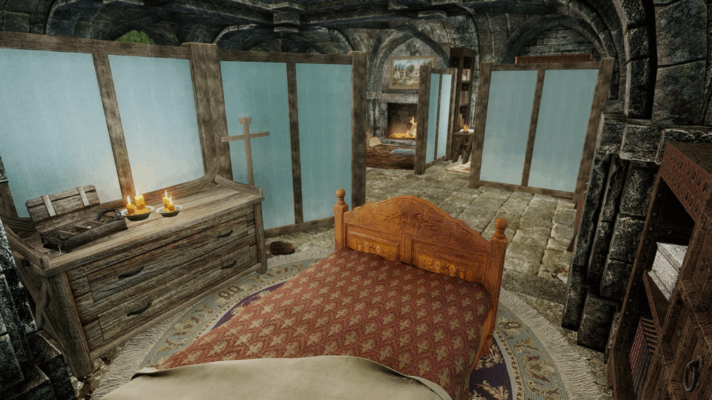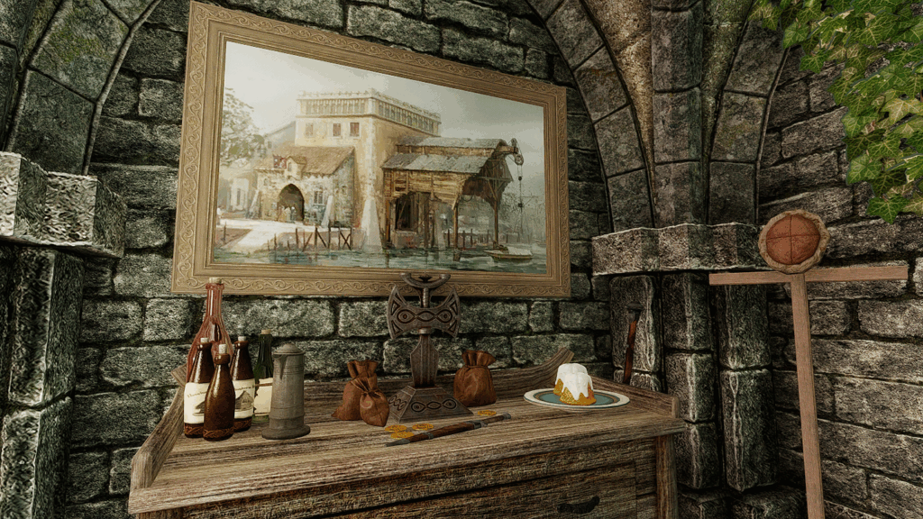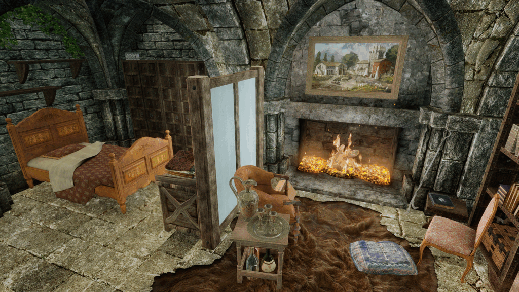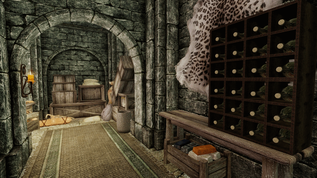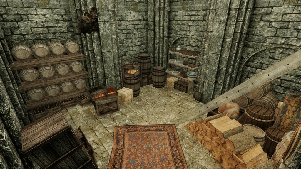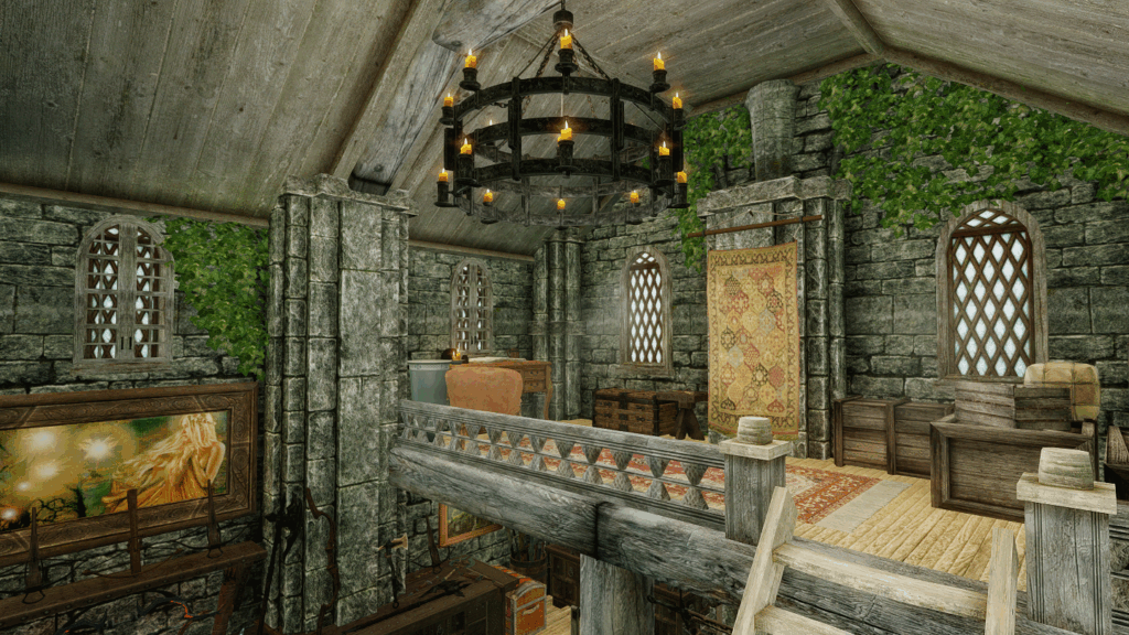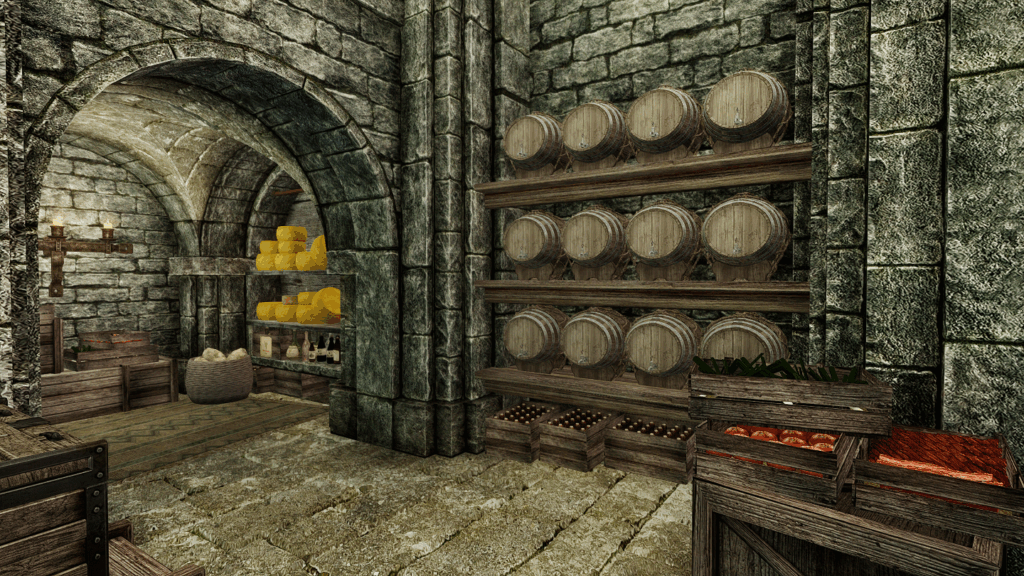 大規模な集落・家追加MODです。屋内外の隅々まで丁寧に作り込まれているのがとても感じられました。衛兵の詰所のような場所に、恐らく暇つぶしに使っているのであろうカードゲームやお酒が置かれているのが特に印象に残っています。