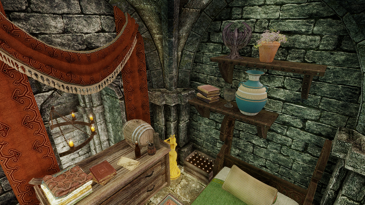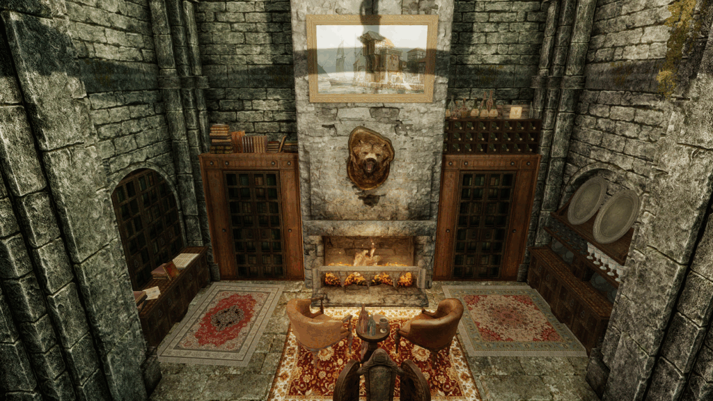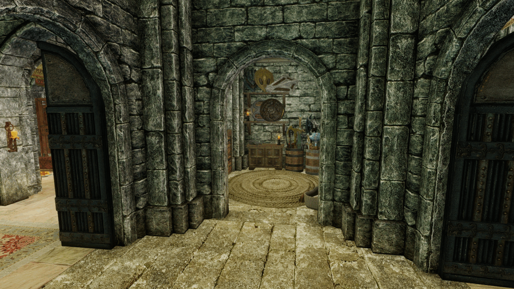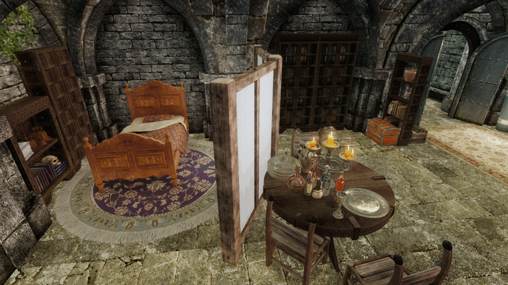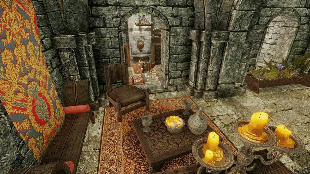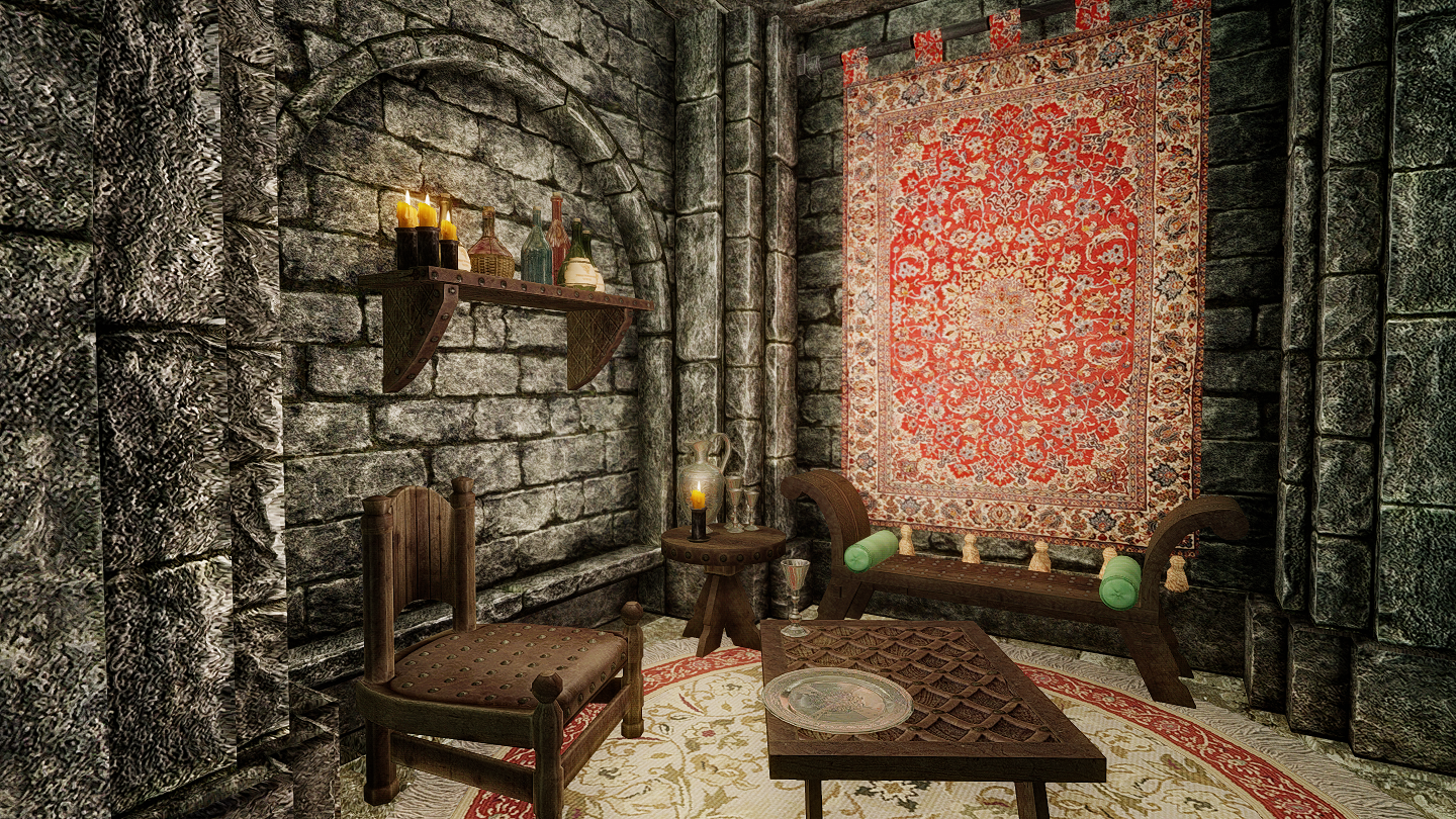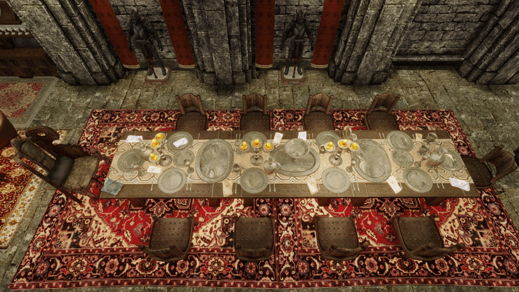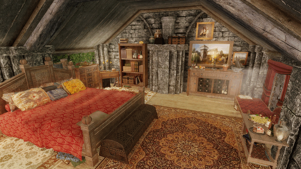 大規模な集落・家追加MODです。屋内外の隅々まで丁寧に作り込まれているのがとても感じられました。衛兵の詰所のような場所に、恐らく暇つぶしに使っているのであろうカードゲームやお酒が置かれているのが特に印象に残っています。