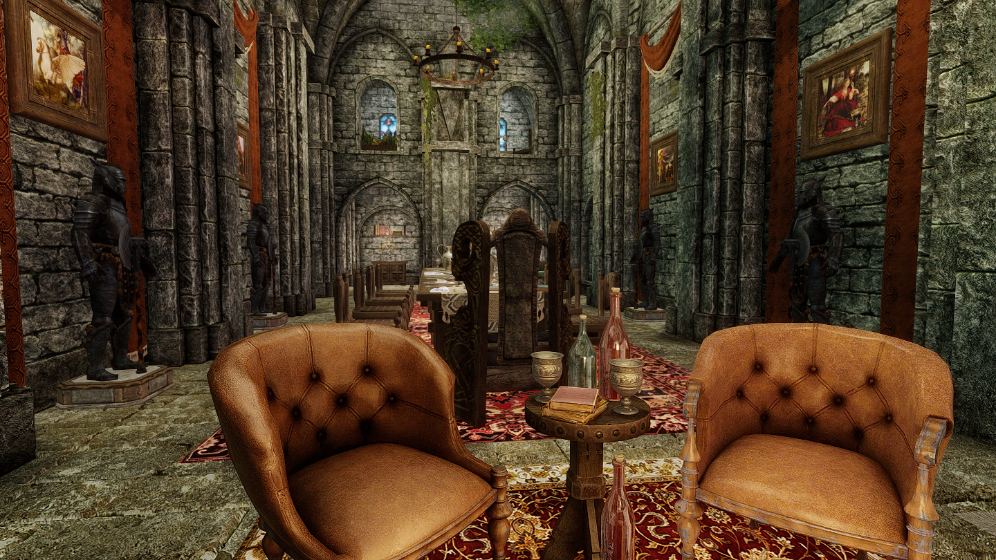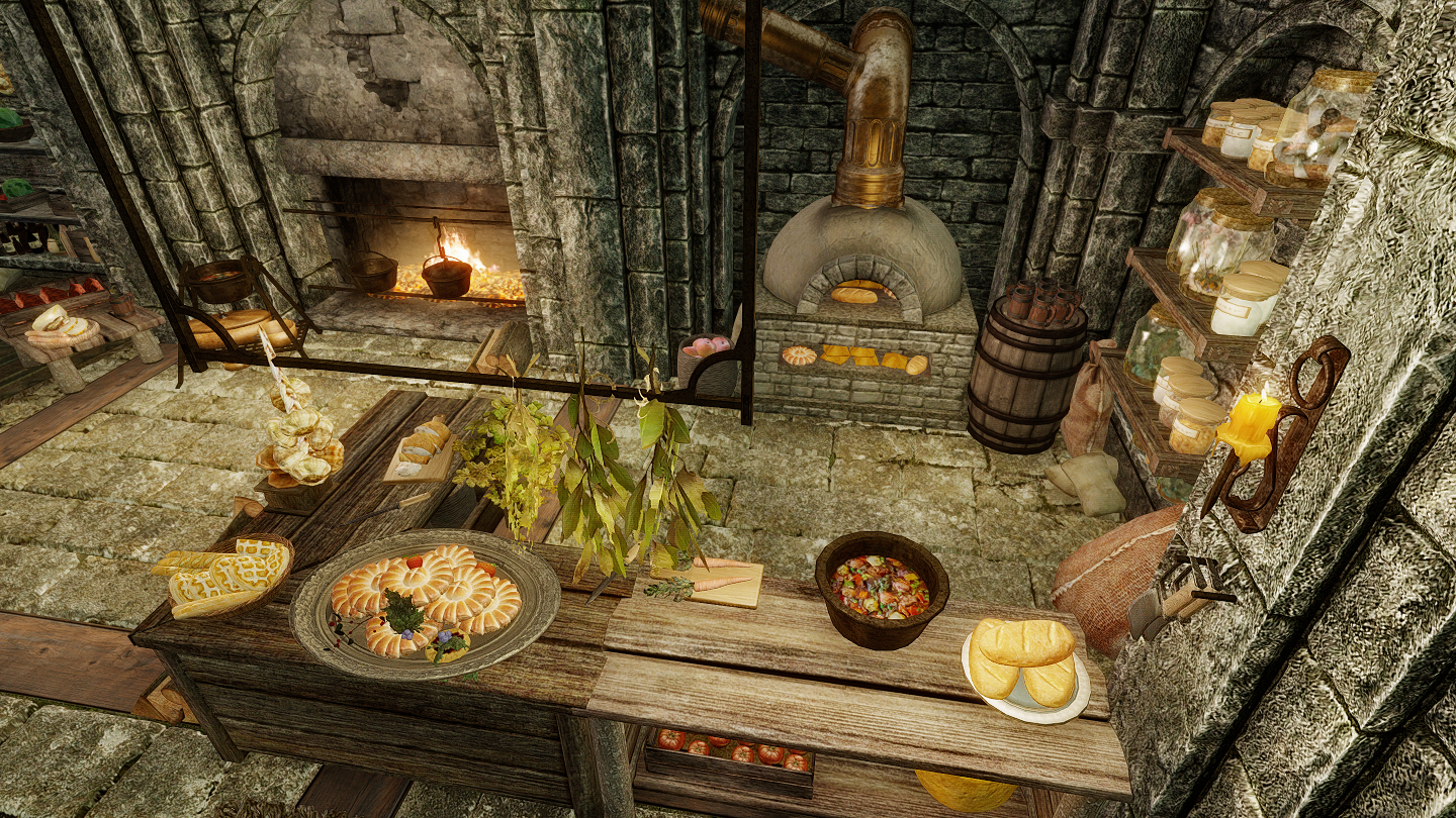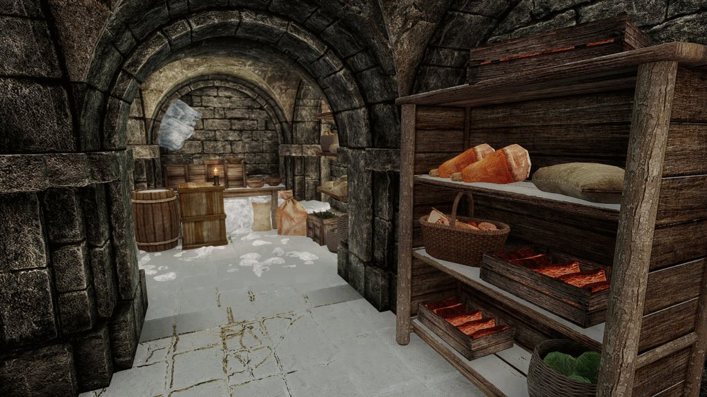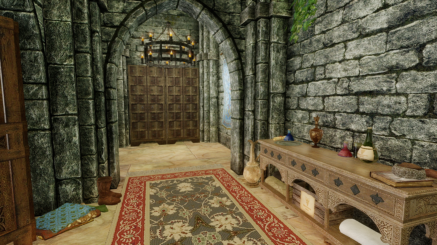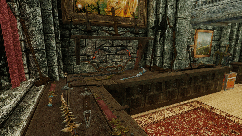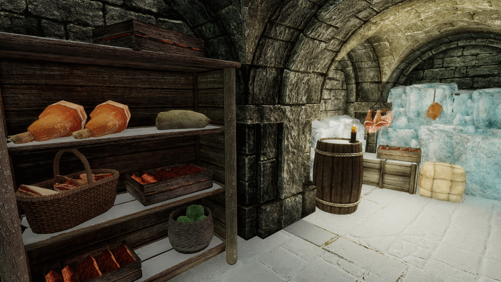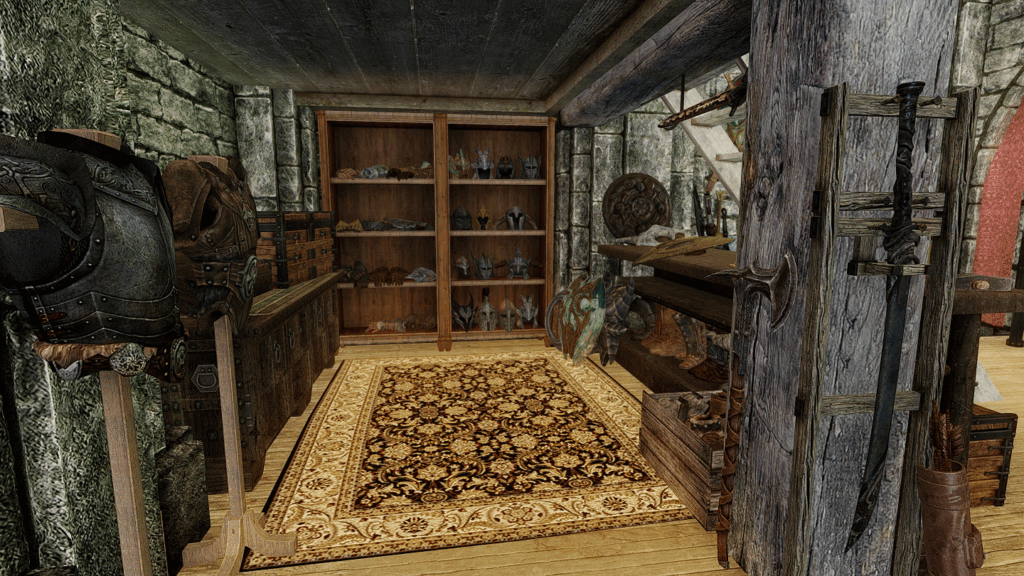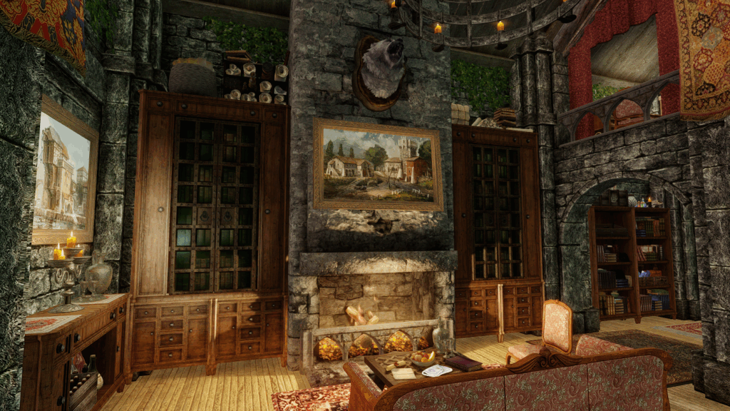 大規模な集落・家追加MODです。屋内外の隅々まで丁寧に作り込まれているのがとても感じられました。衛兵の詰所のような場所に、恐らく暇つぶしに使っているのであろうカードゲームやお酒が置かれているのが特に印象に残っています。