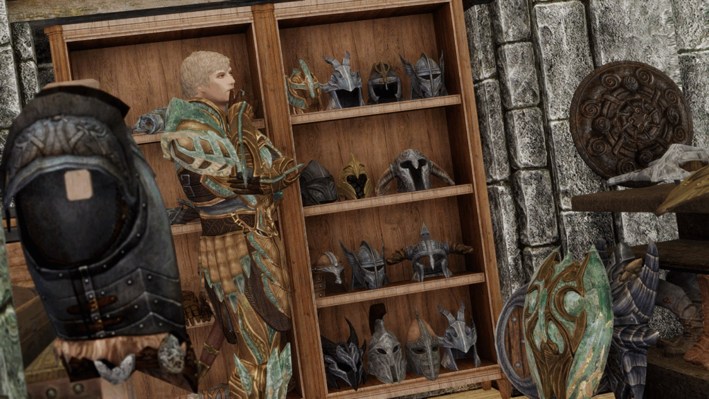 武器保管棚や展示箱に好きな装備を展示できるエリアと、カテゴリ別に収納しておけるエリアがあります。