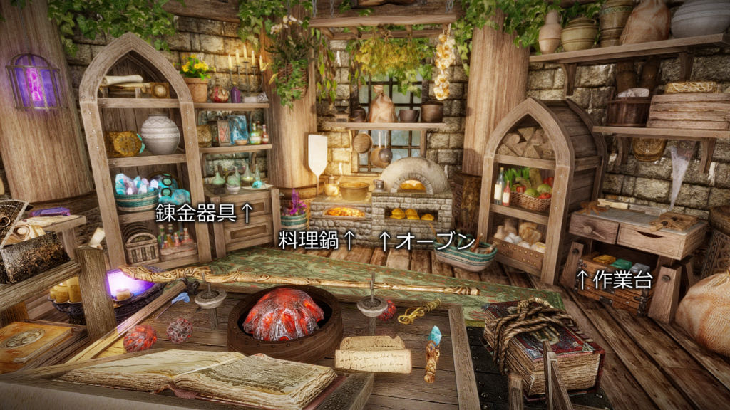 - 後側:錬金器具/料理鍋/オーブン/作業台/金床/精錬鍋(溶鉱炉)