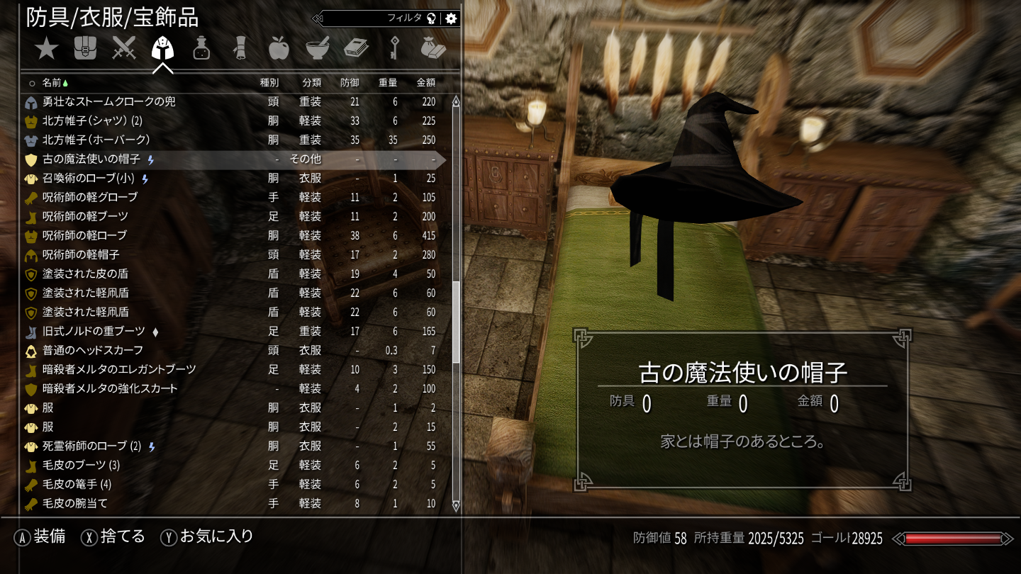 導入後、通知と共にインベントリに「古の魔法使いの帽子」が追加されます。それを装備した直後に「勇者の聖域」と名付けられたこのMODの家に入れます。