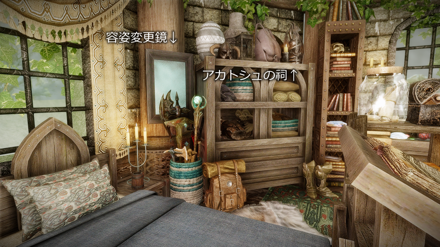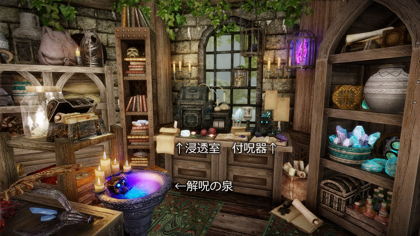 - 前側:砥石/皮なめしの棚/マネキン/シングルベッド×1/容姿変更鏡/アカトシュの祠/杖の付呪器/解呪の泉/浸透室/付呪器