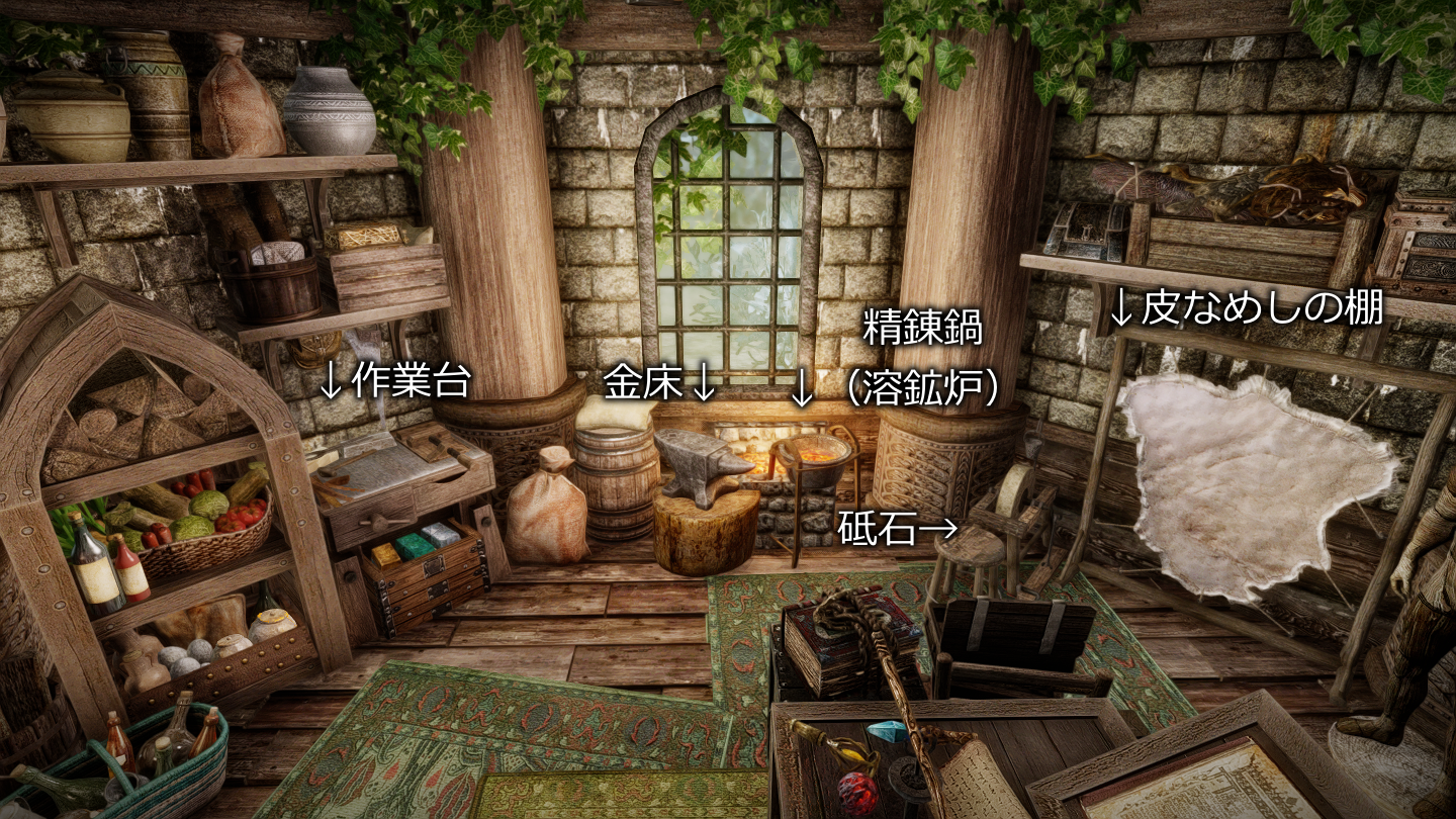 - 後側:錬金器具/料理鍋/オーブン/作業台/金床/精錬鍋(溶鉱炉)