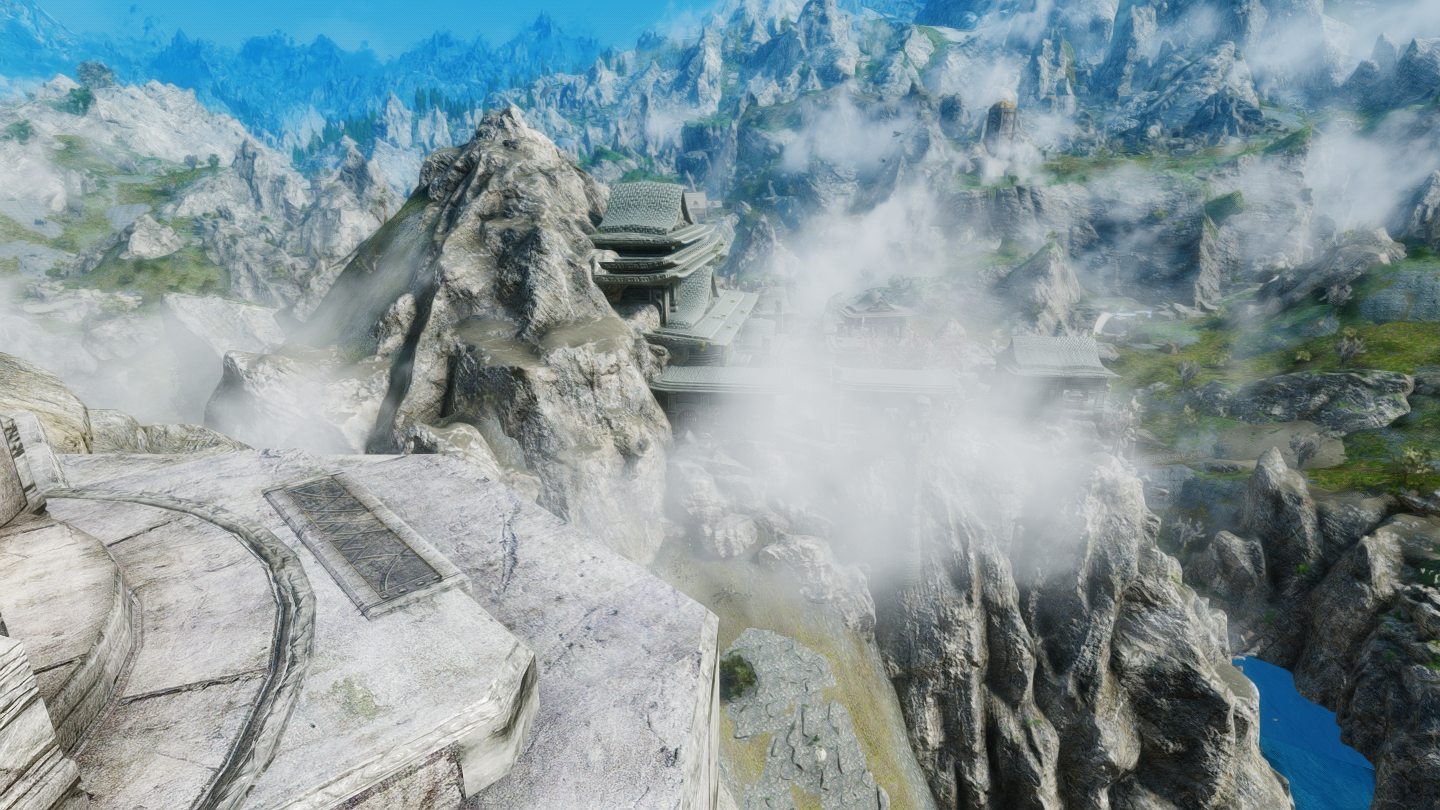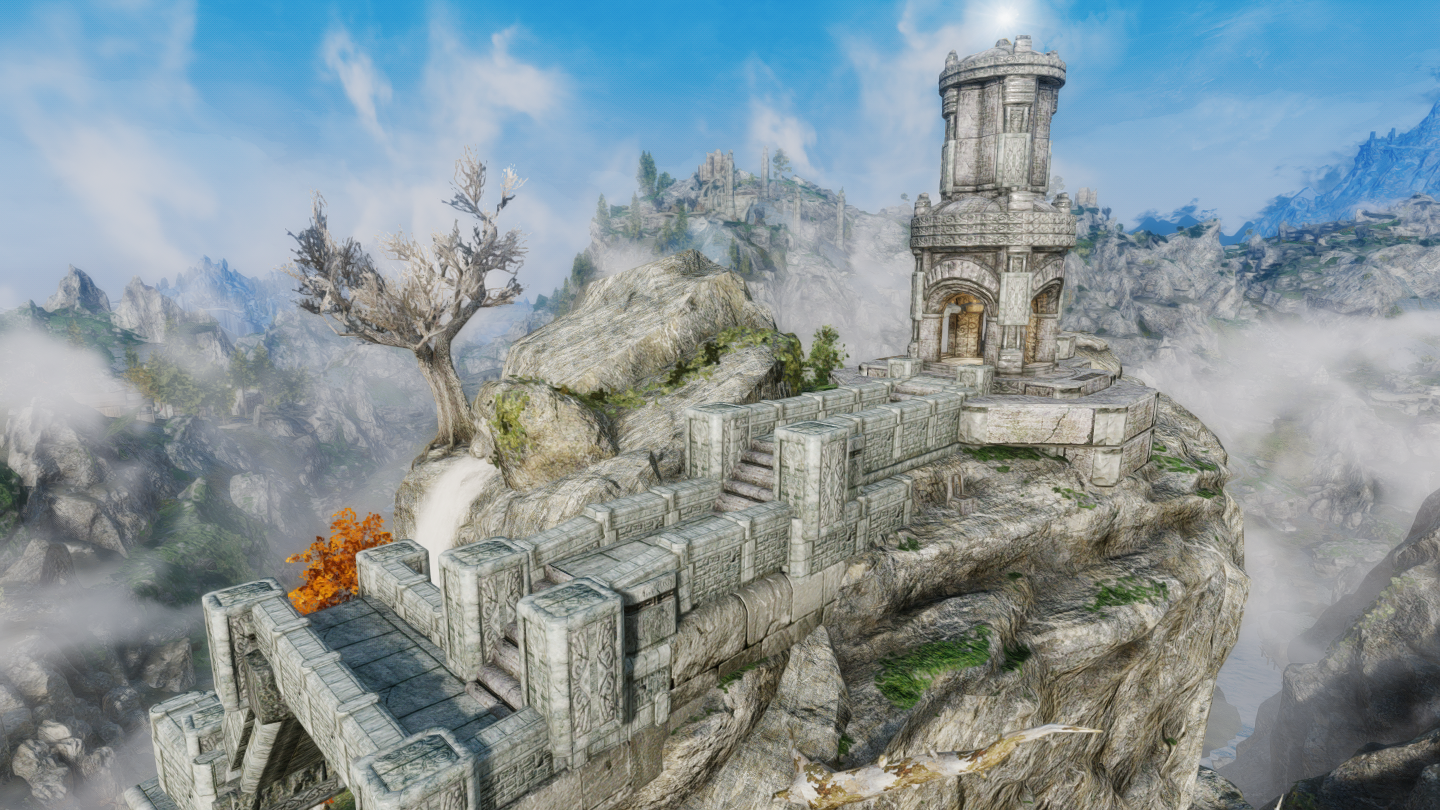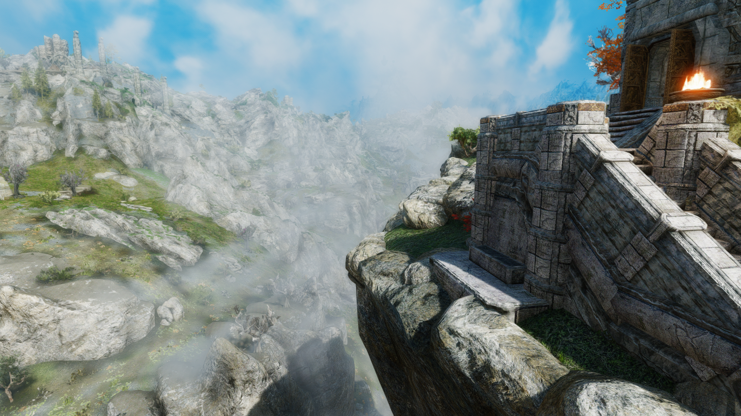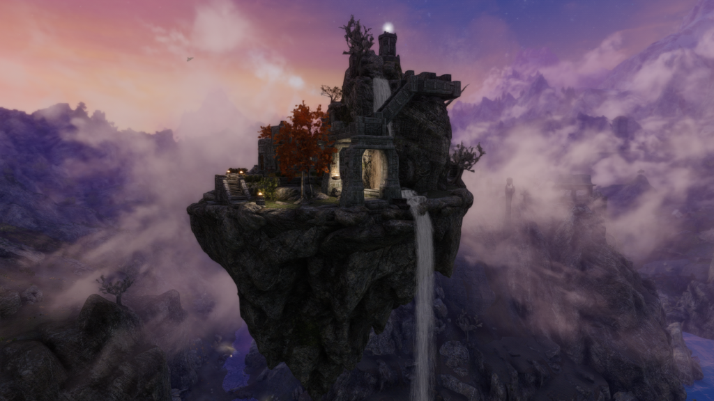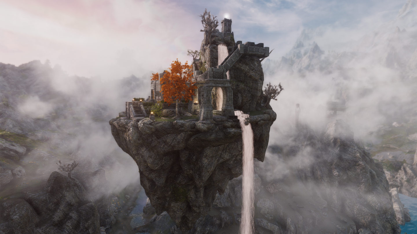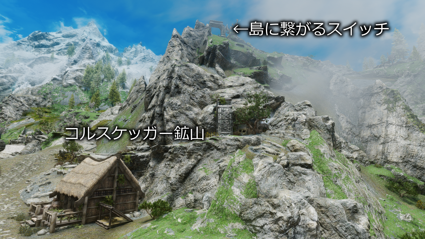 リーチ地方・恋人の石碑やコルスケッガー鉱山の近くに、石造りの浮遊島タイプの家を追加するMODです。足場を渡って行き来できる箇所がいくつかあります。