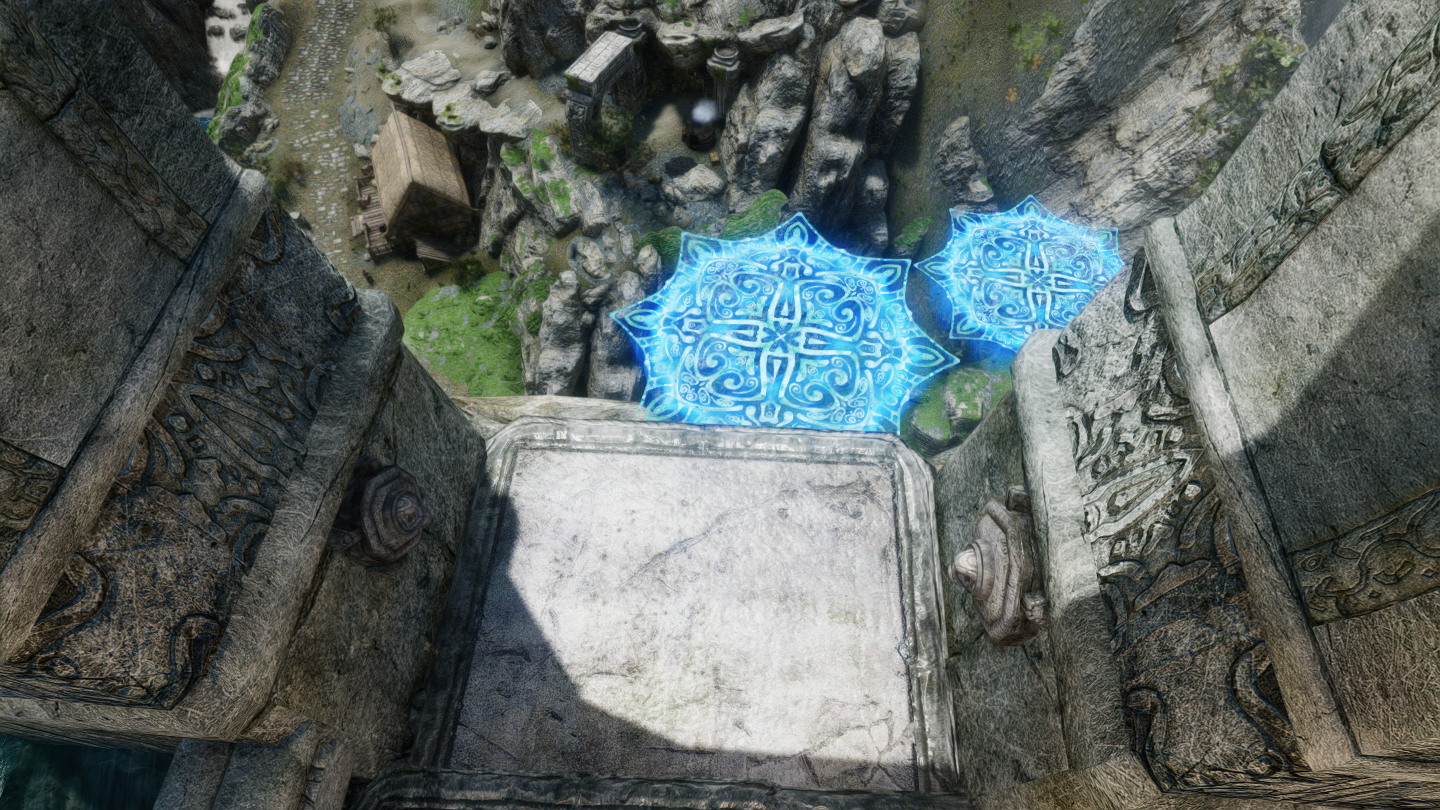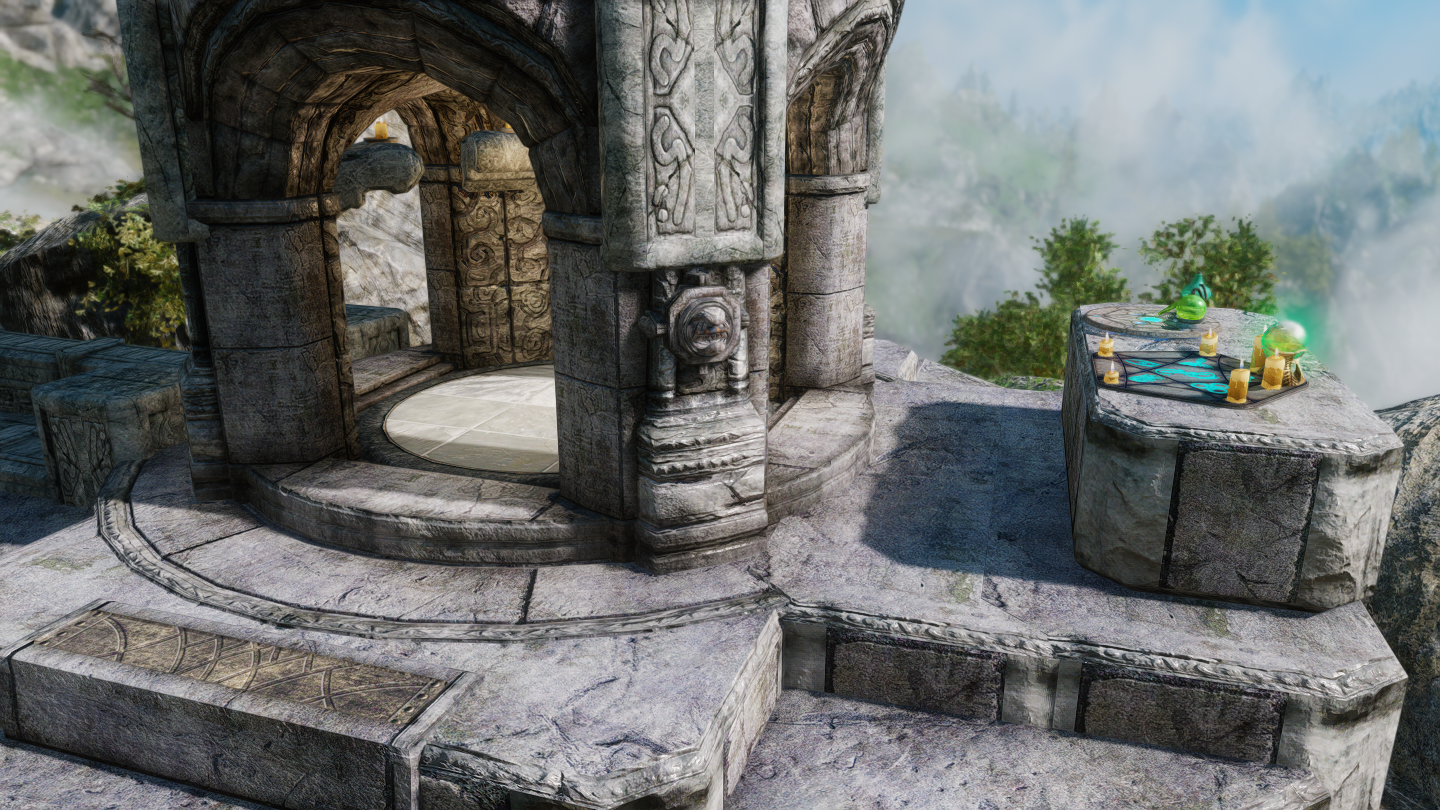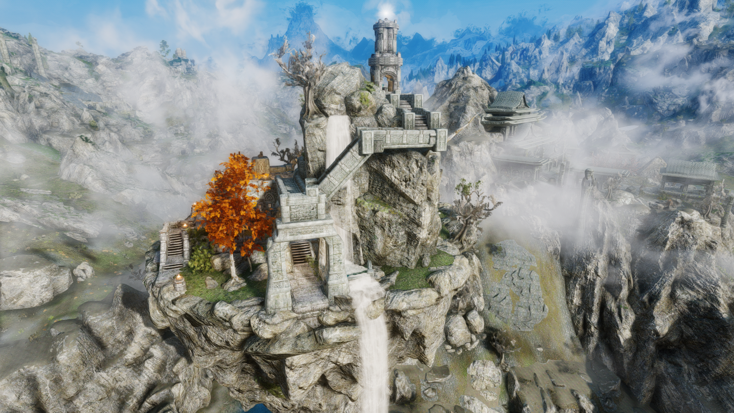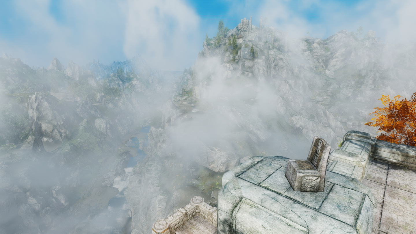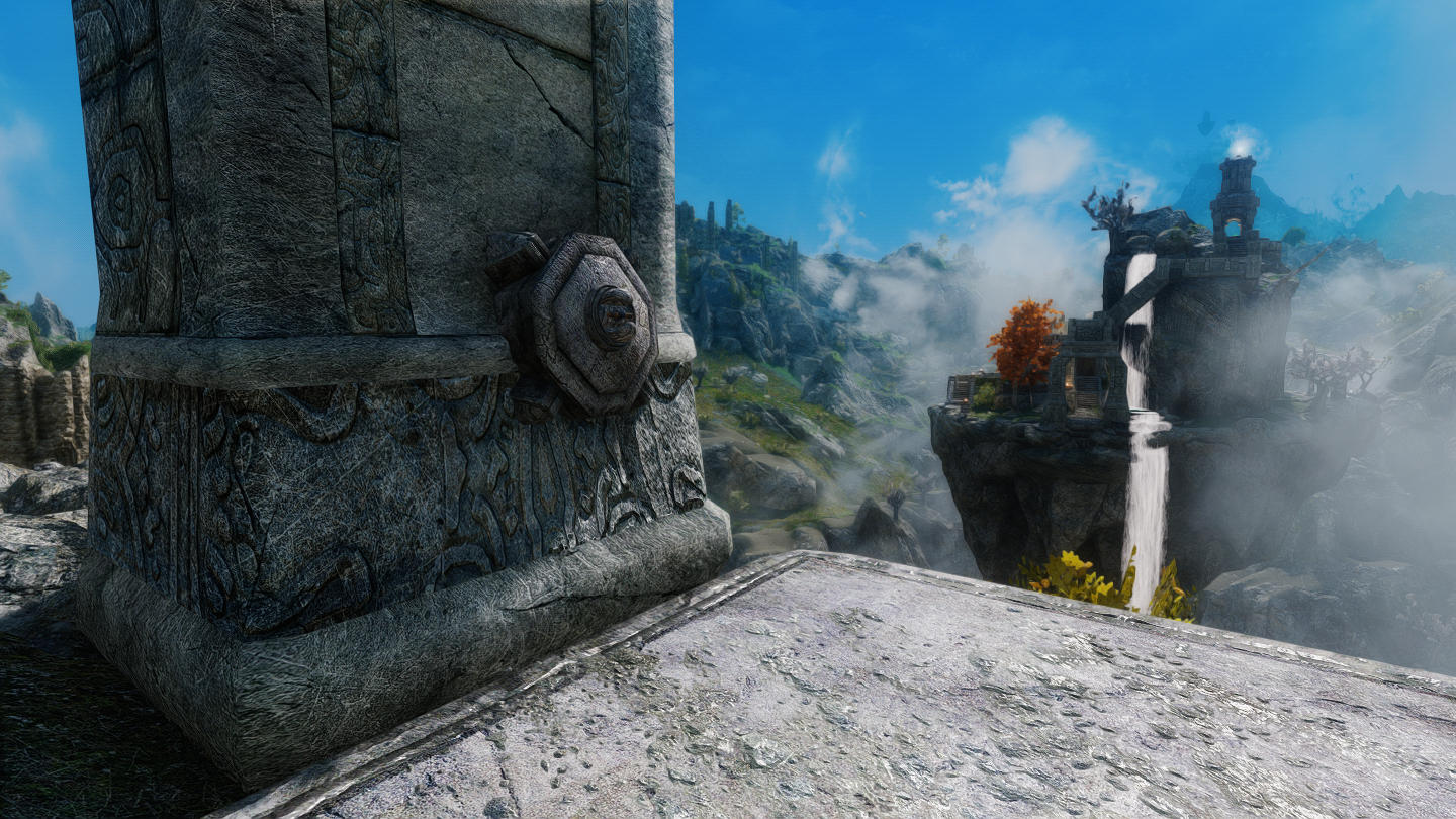リーチ地方・恋人の石碑やコルスケッガー鉱山の近くに、石造りの浮遊島タイプの家を追加するMODです。足場を渡って行き来できる箇所がいくつかあります。