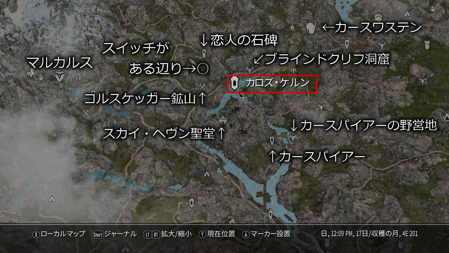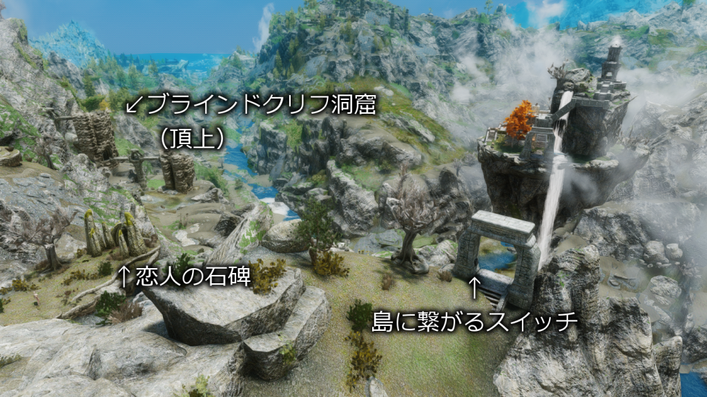 スイッチで足場を出現させて島に渡っていく形になっています。スイッチはリーチ地方にあるコルスケッガー鉱山や恋人の石碑近くの崖の上です。ブラインドクリフ洞窟の頂上からも向かえるかと。