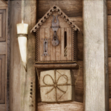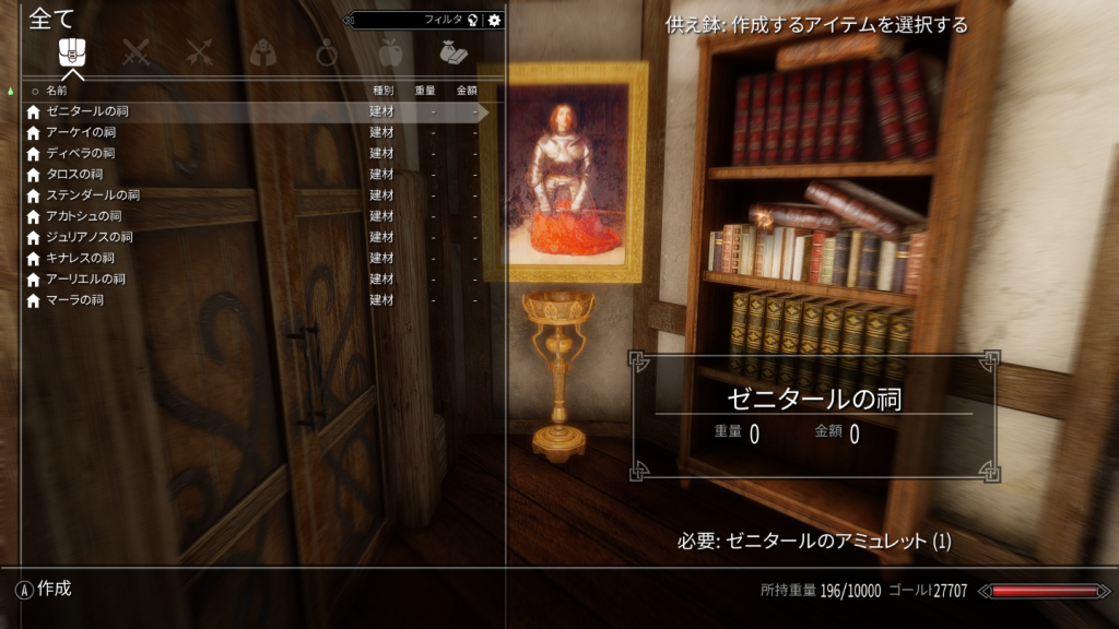 窓際にあるジュリアノスの祠は、供え鉢からお好みの祠(九大神+アーリエル)を作成・変更できます。九大神は各信仰のアミュレット、アーリエルの祠は錬金素材である鷹の羽が材料になっています。