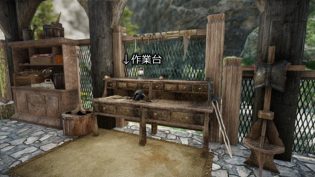 - 家周辺:皮なめしの棚/砥石/作業台/鋳造器具/薪割り台/肥沃土×9/鶏/ヤギ