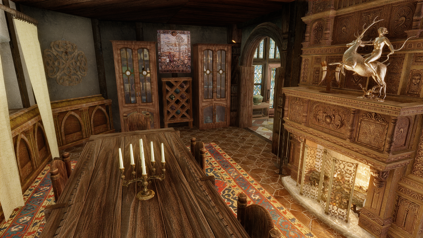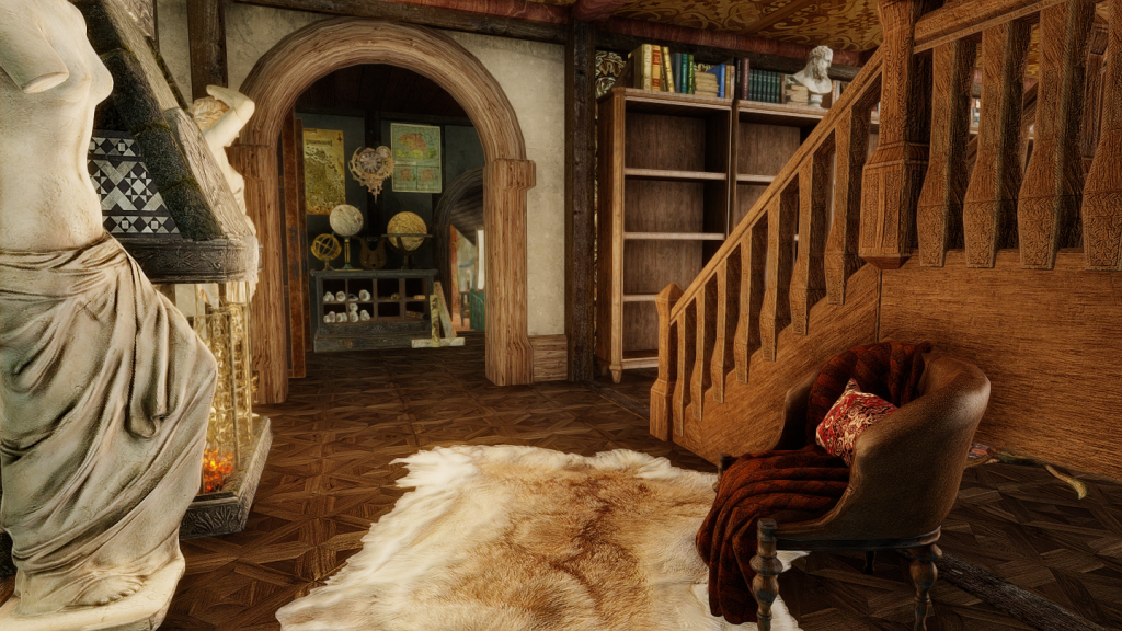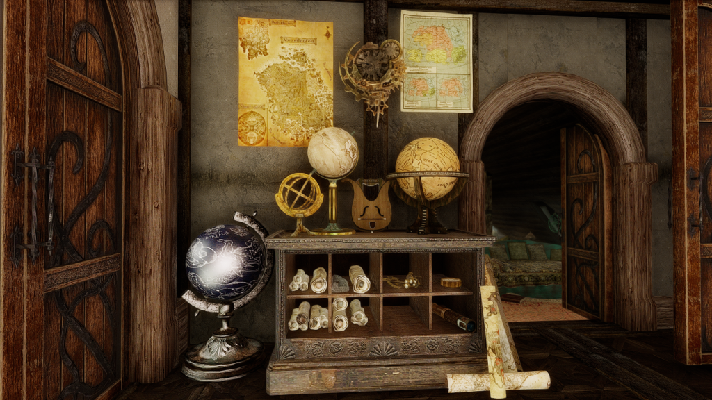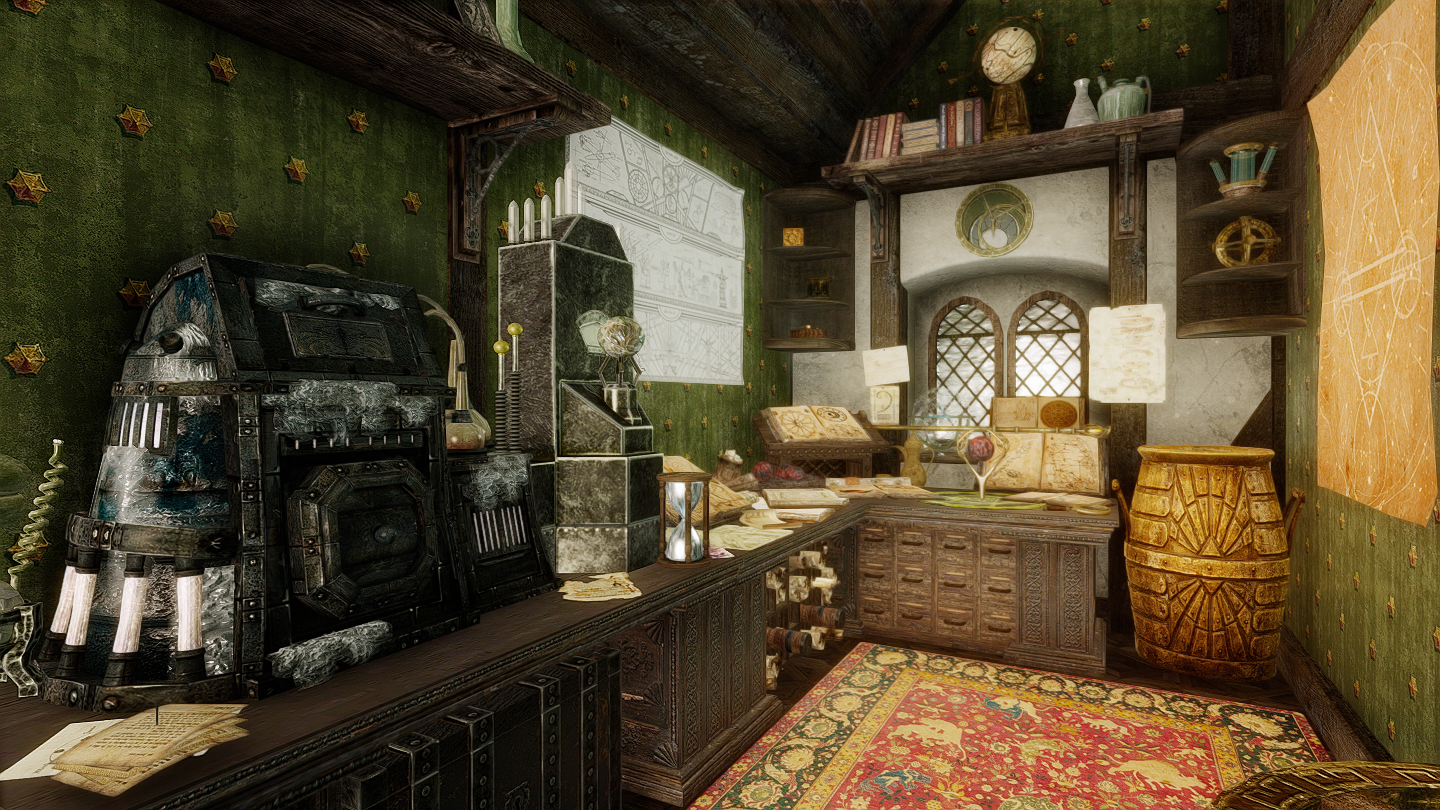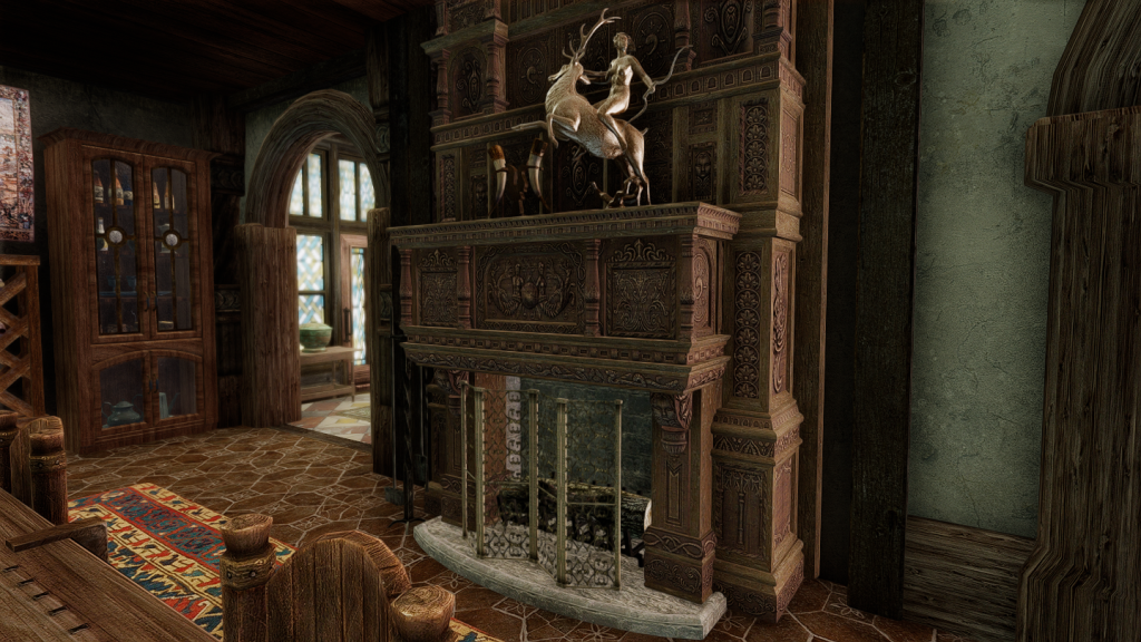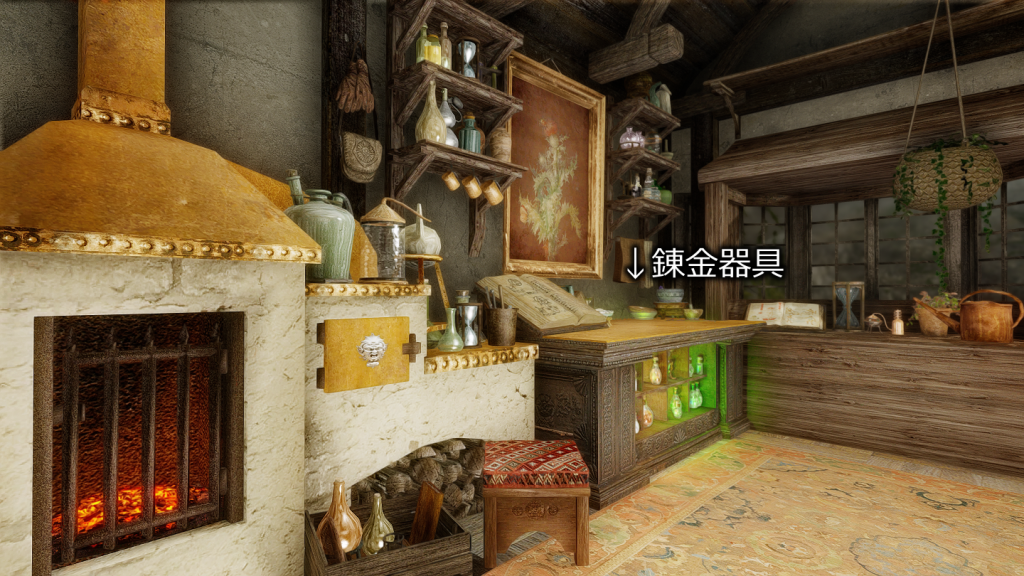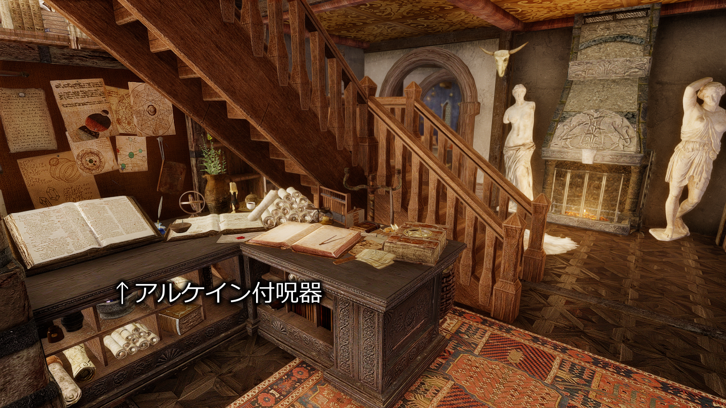 暖炉の近くの机がアルケイン付呪器になっています。また、窓際にある陳列棚の扉は開閉可能です。