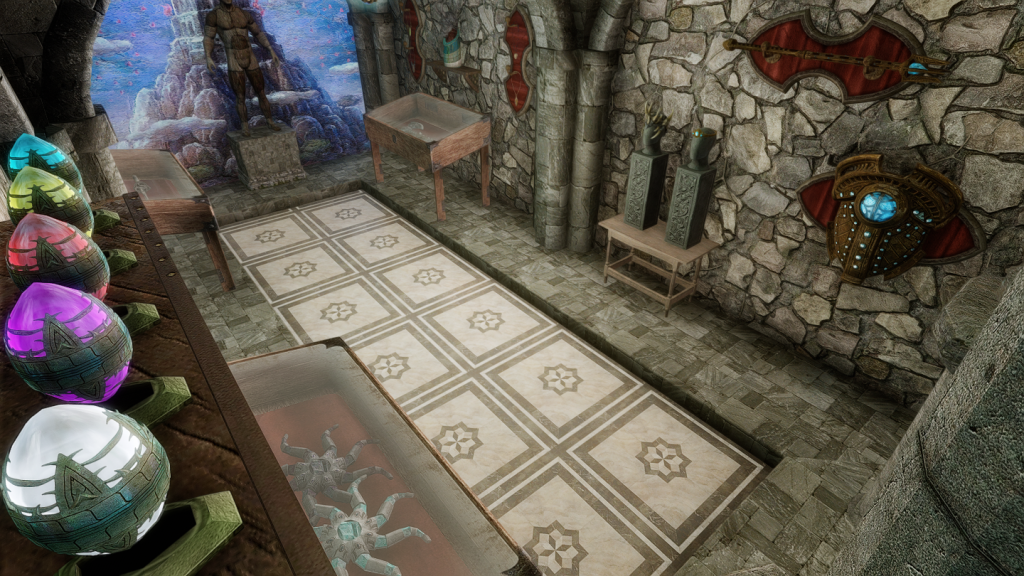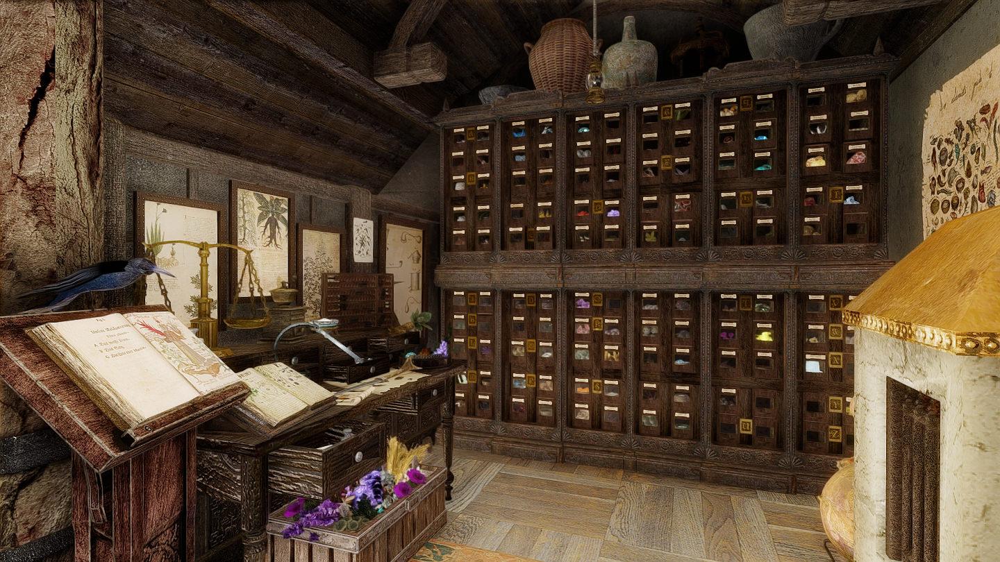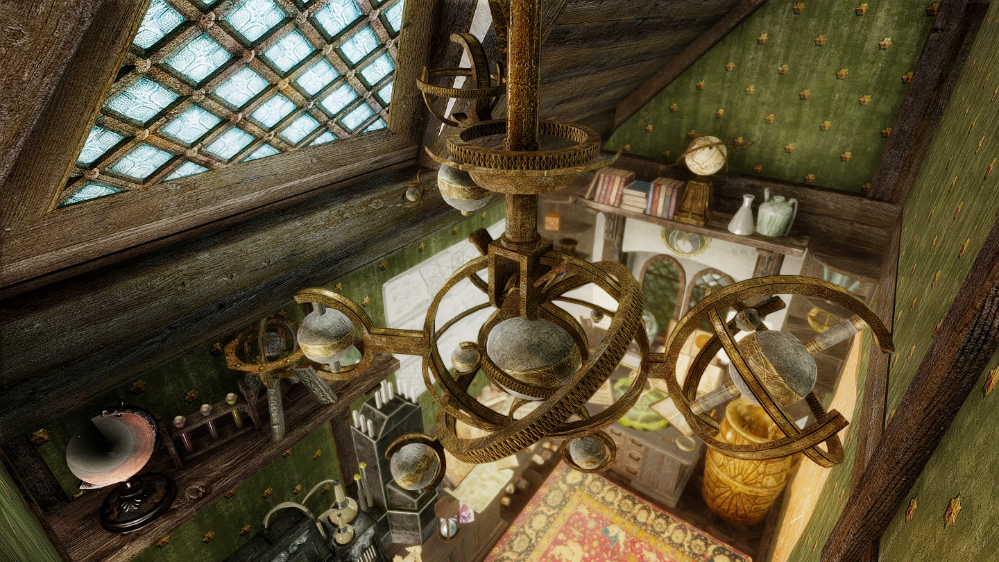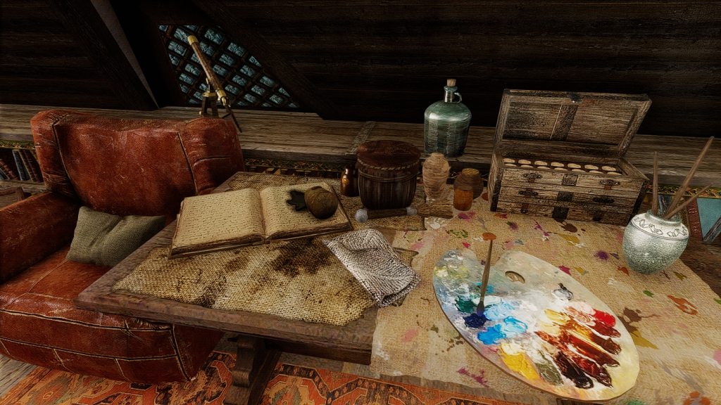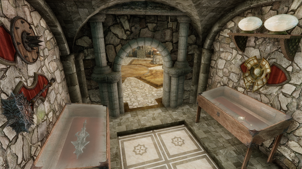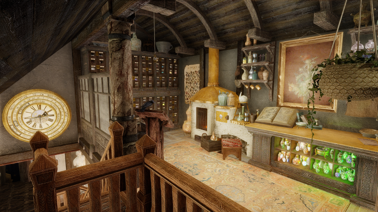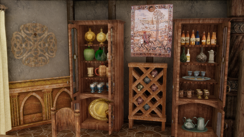 暖炉の近くの机がアルケイン付呪器になっています。また、窓際にある陳列棚の扉は開閉可能です。