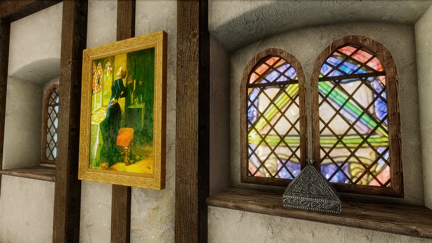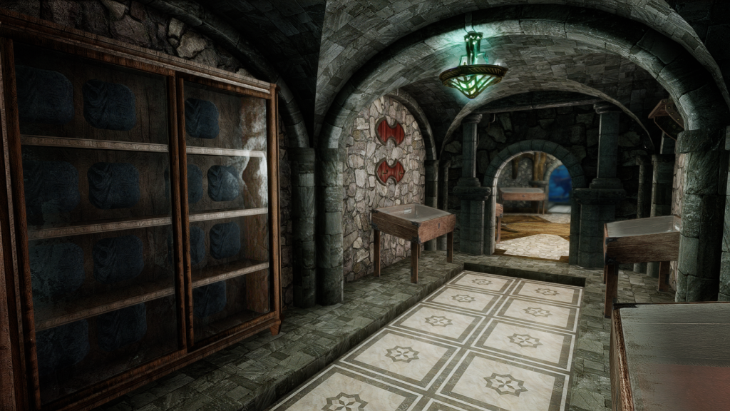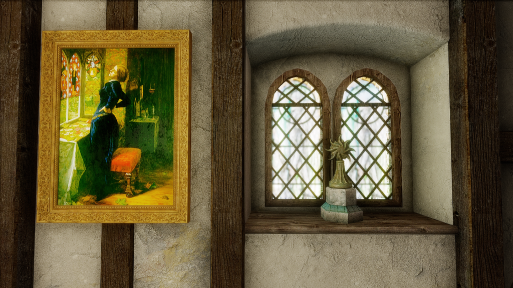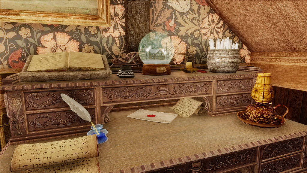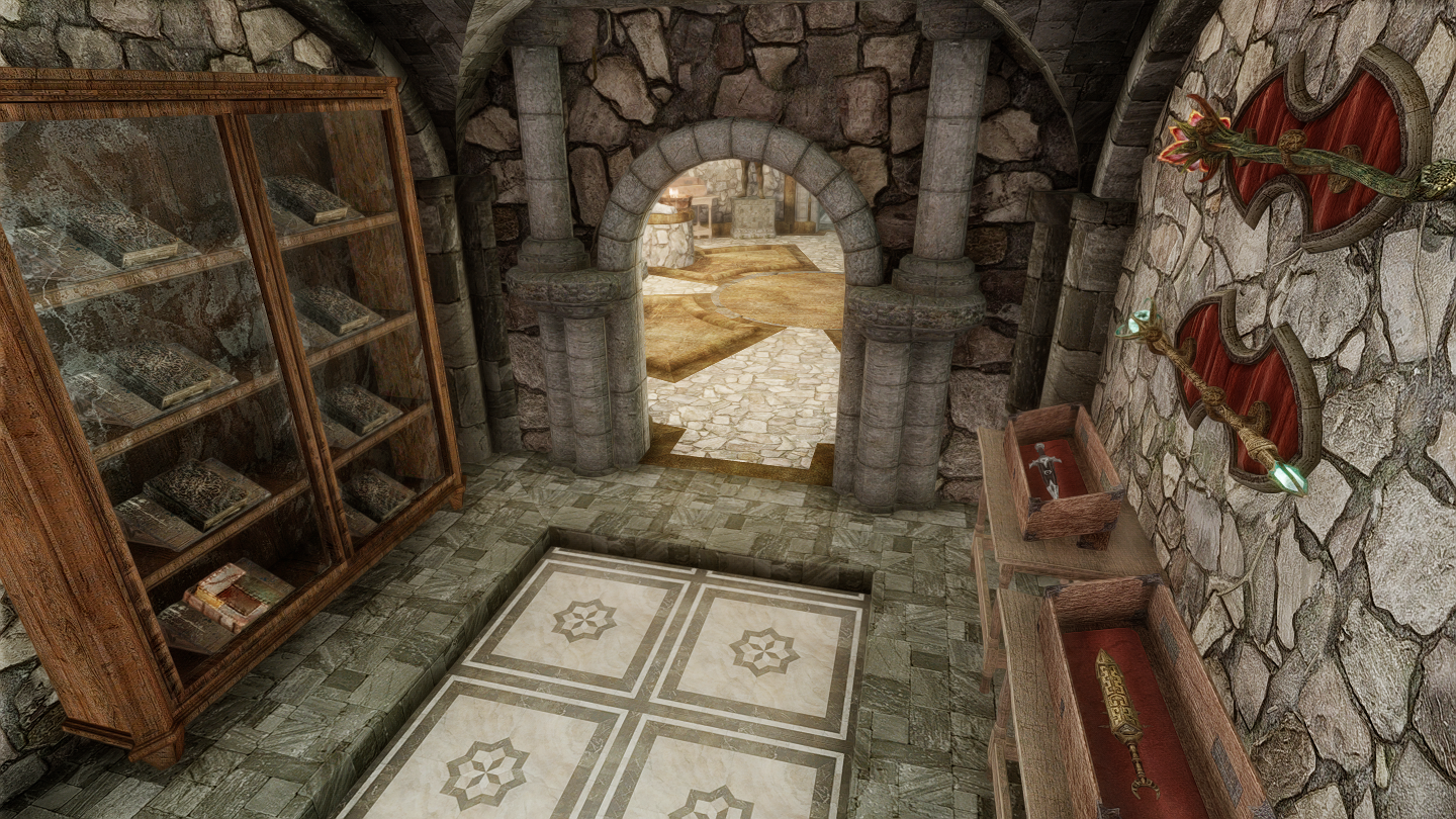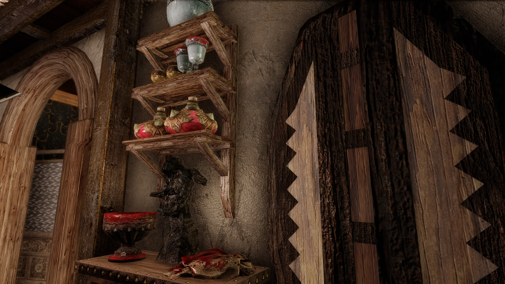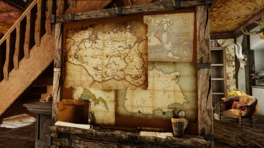 暖炉の近くの机がアルケイン付呪器になっています。また、窓際にある陳列棚の扉は開閉可能です。