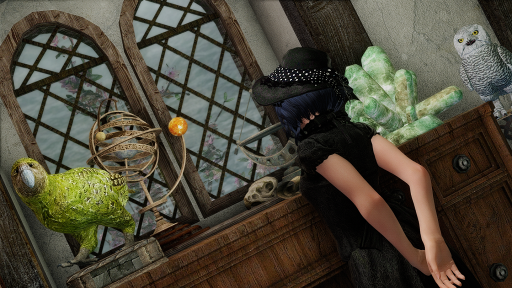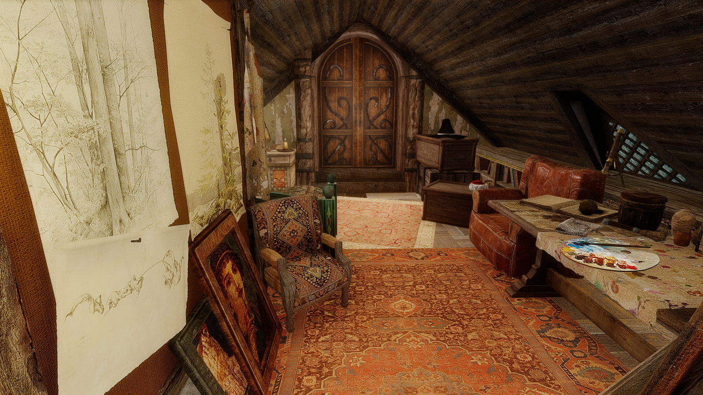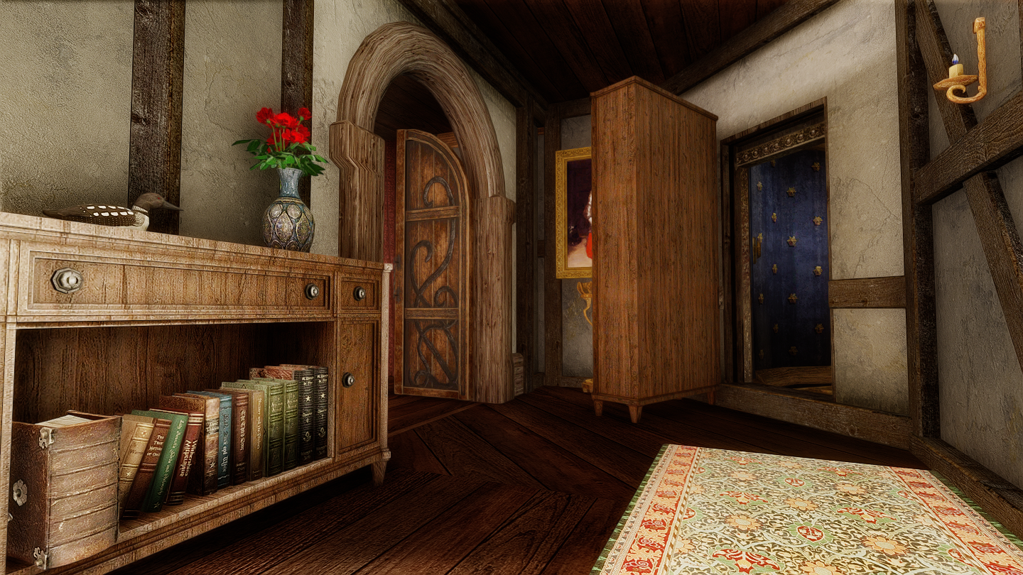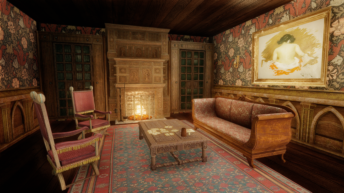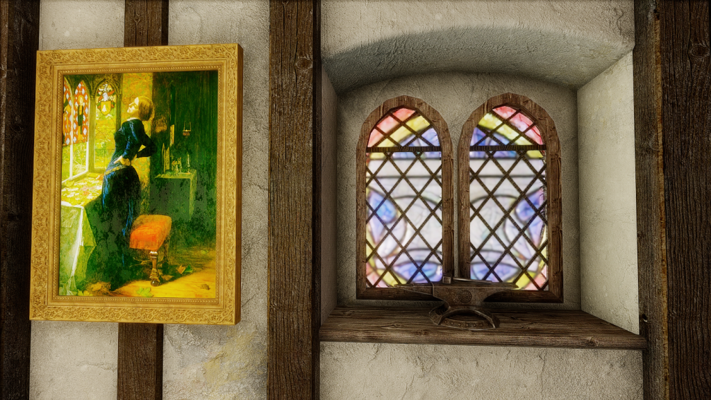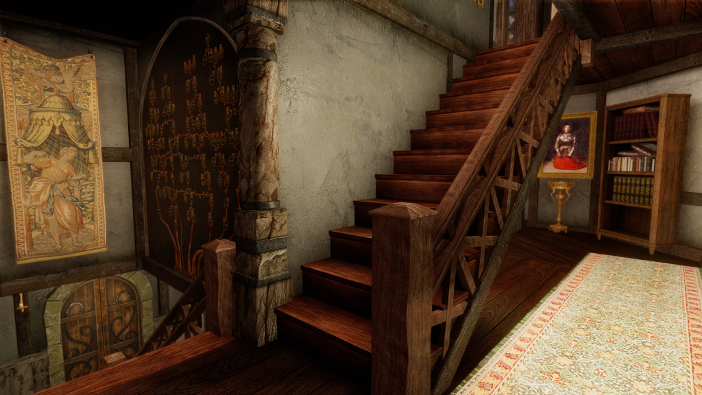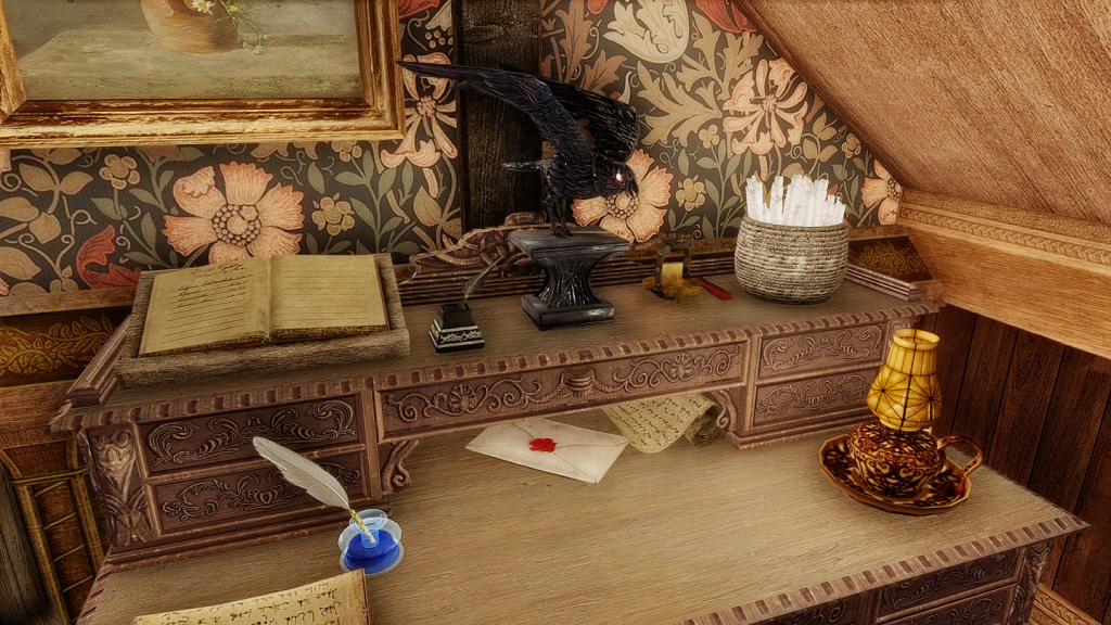 暖炉の近くの机がアルケイン付呪器になっています。また、窓際にある陳列棚の扉は開閉可能です。