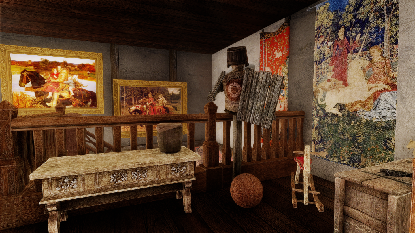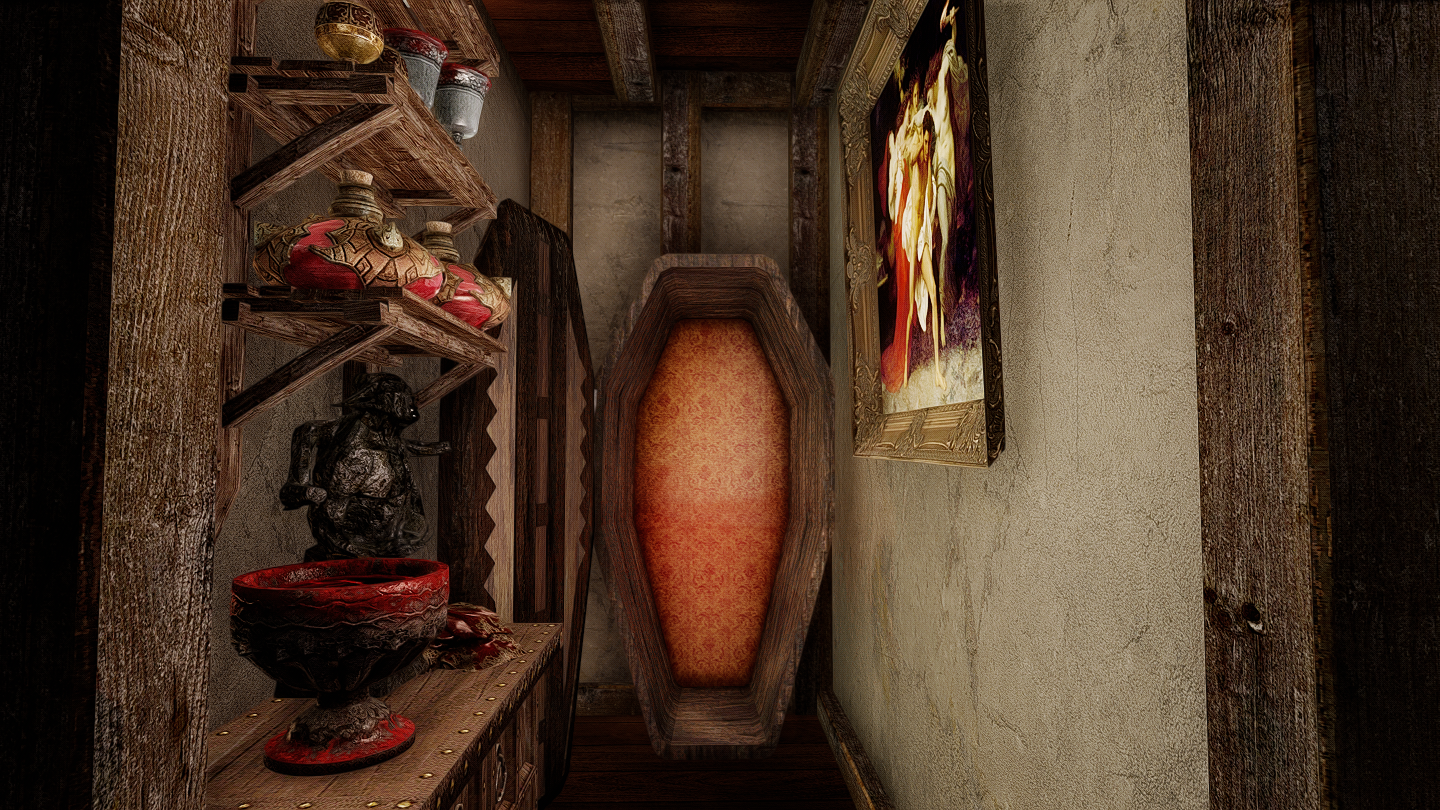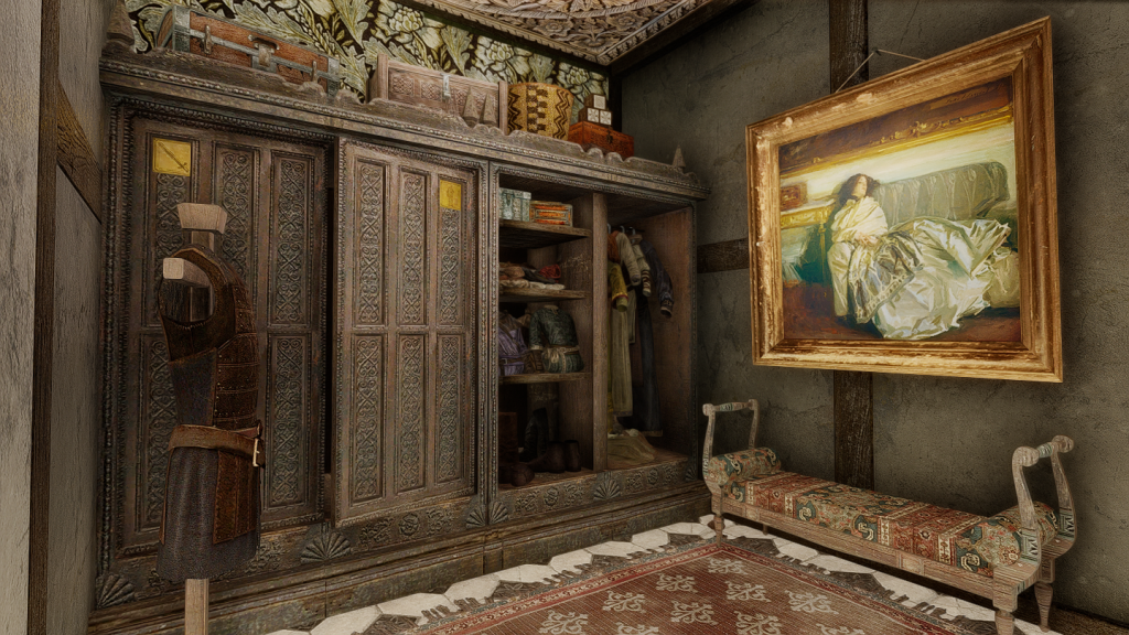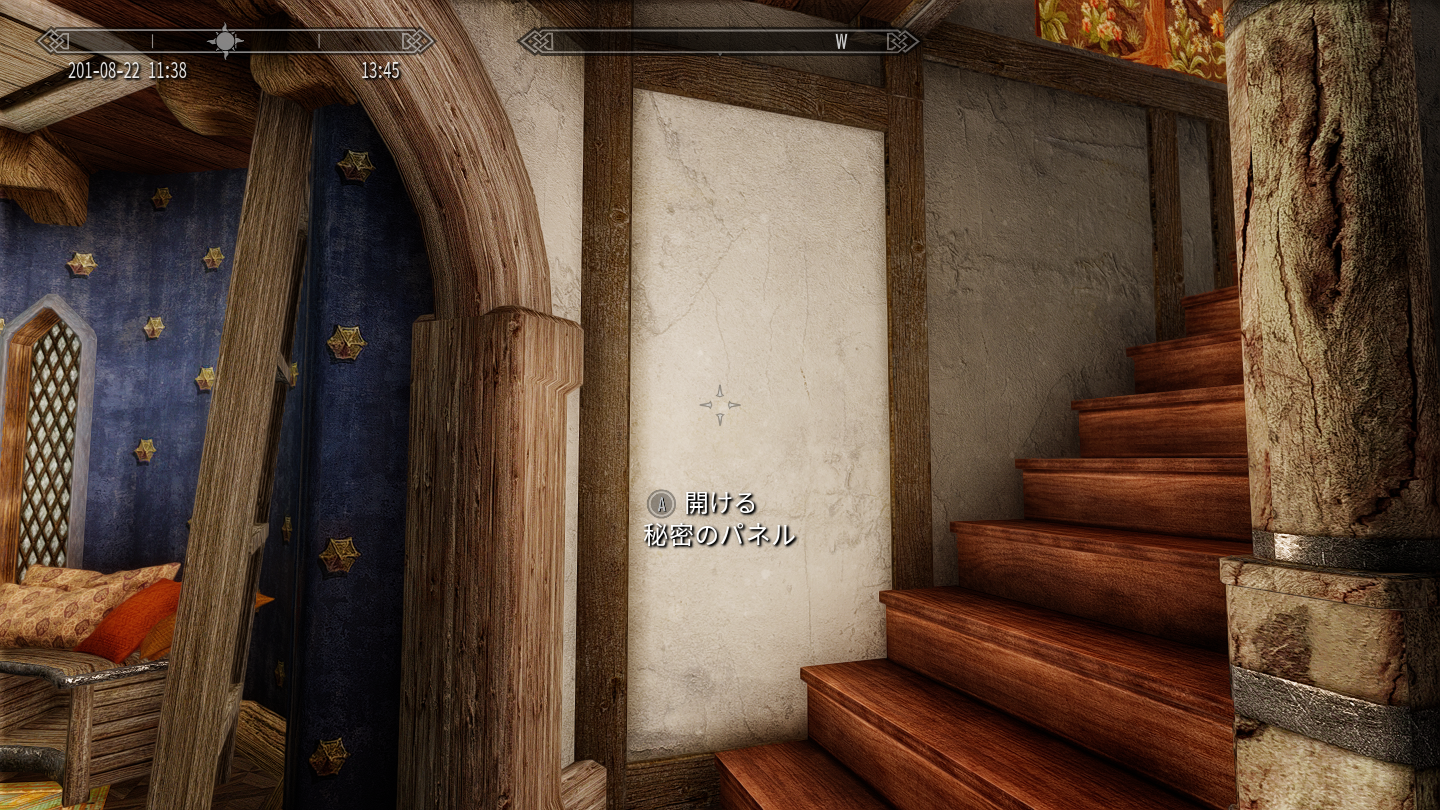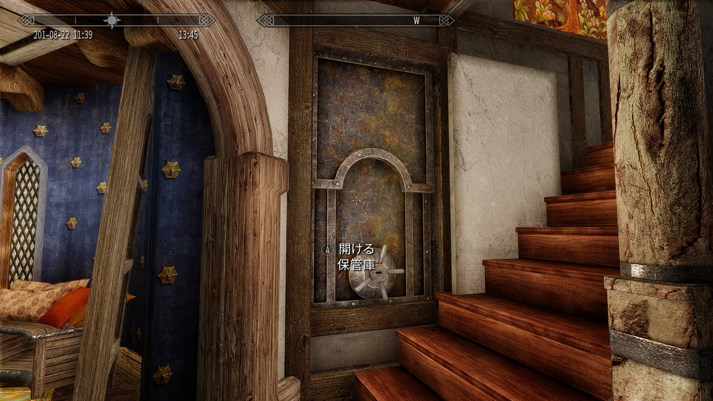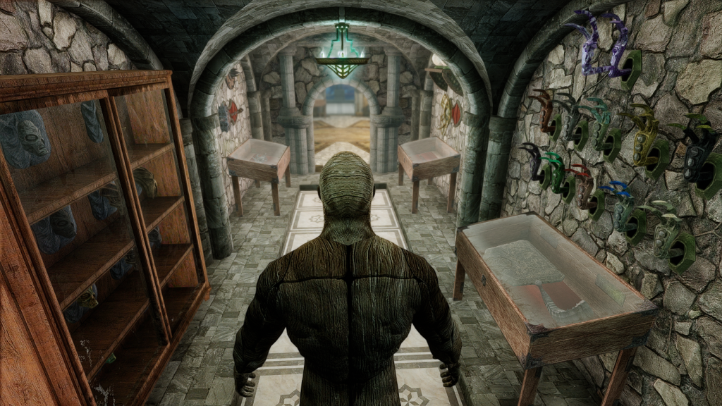 暖炉の近くの机がアルケイン付呪器になっています。また、窓際にある陳列棚の扉は開閉可能です。