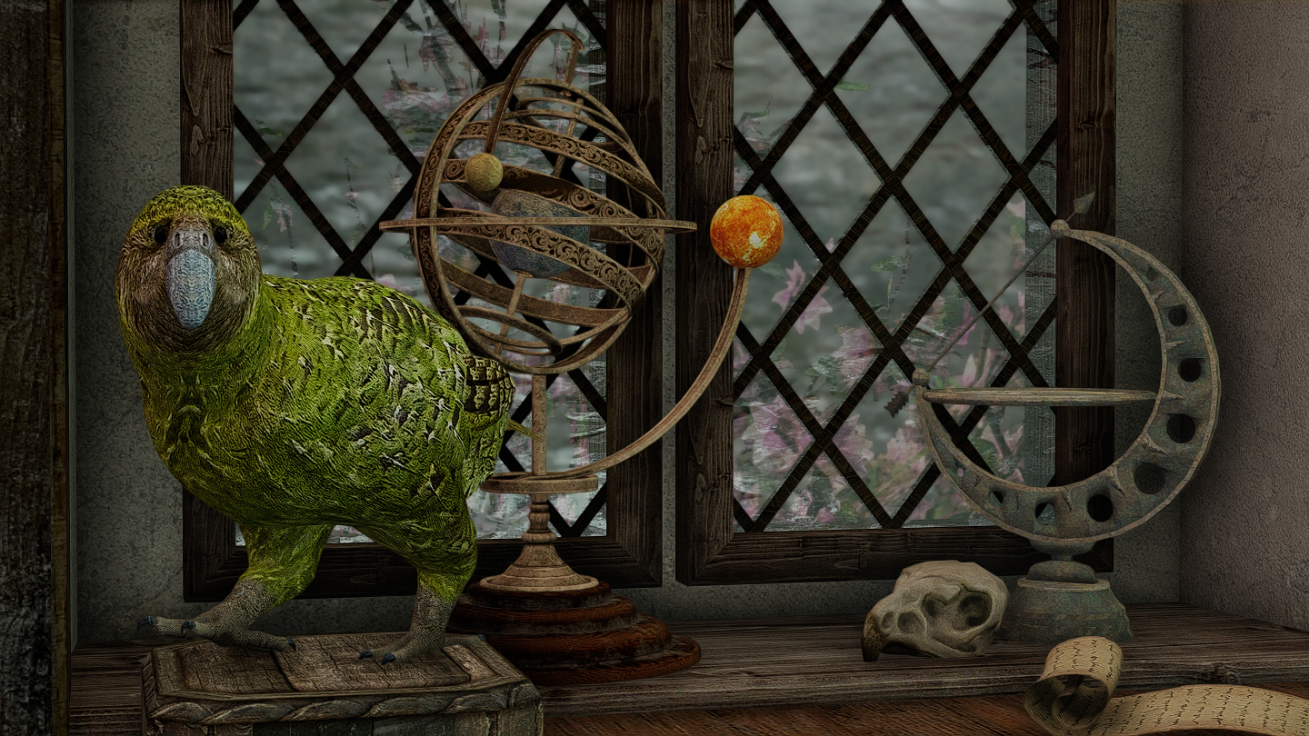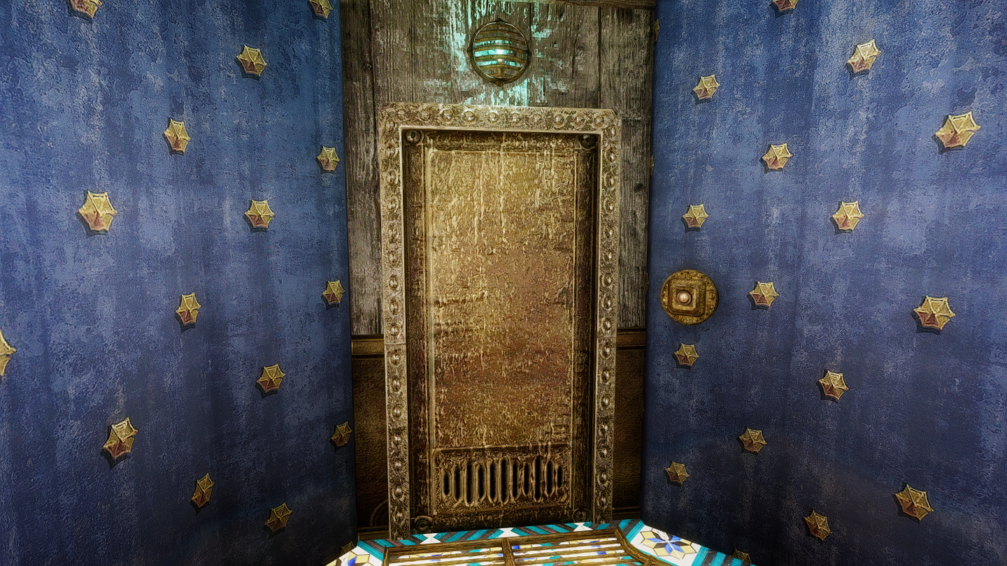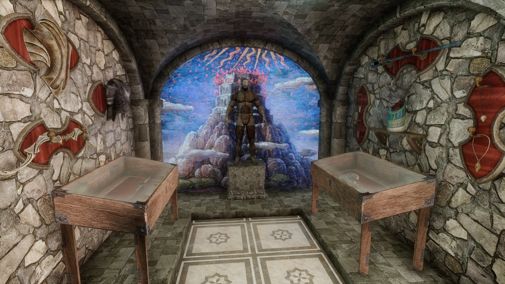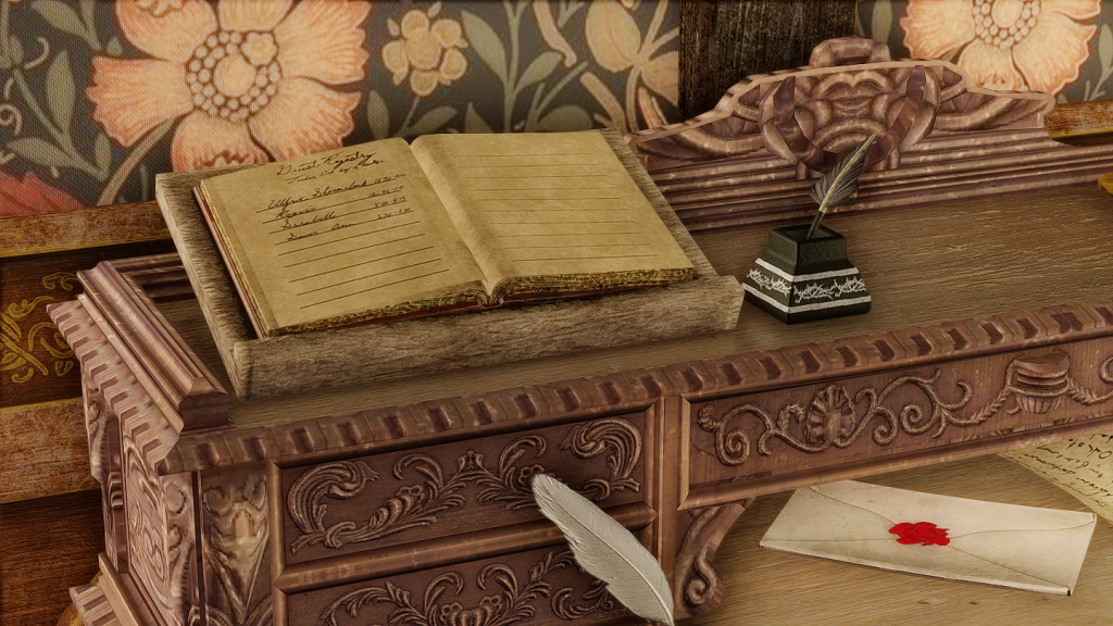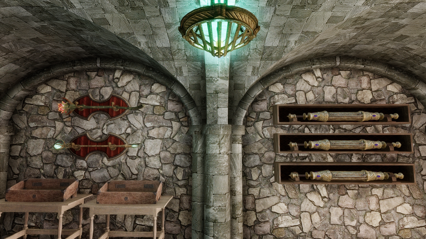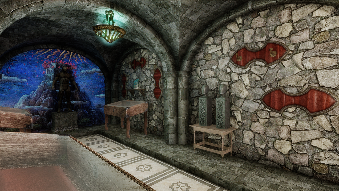 暖炉の近くの机がアルケイン付呪器になっています。また、窓際にある陳列棚の扉は開閉可能です。