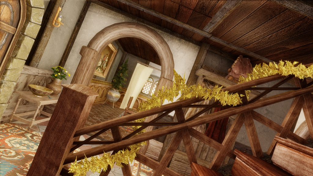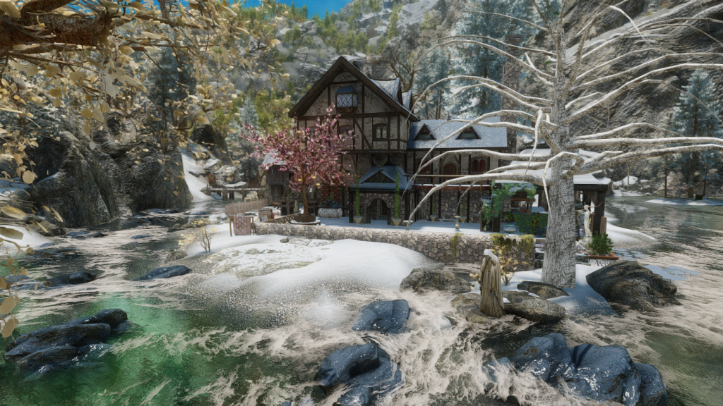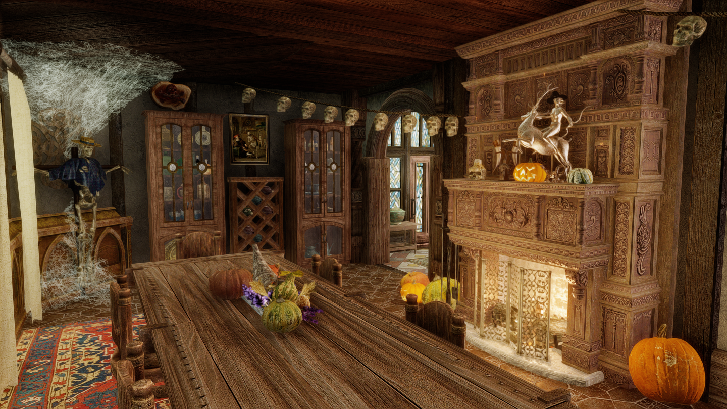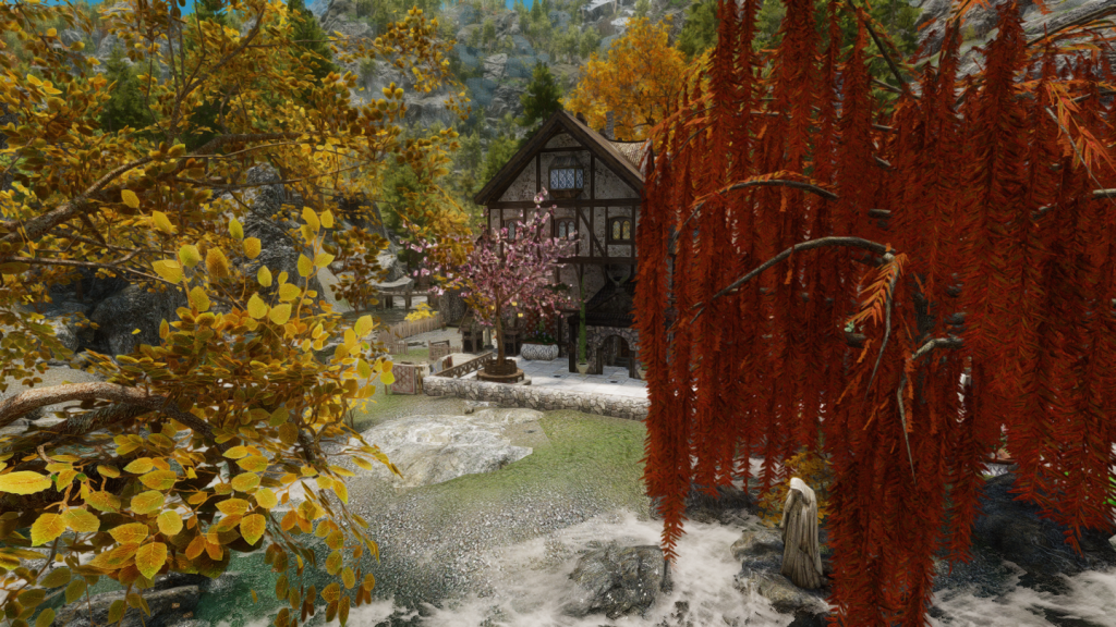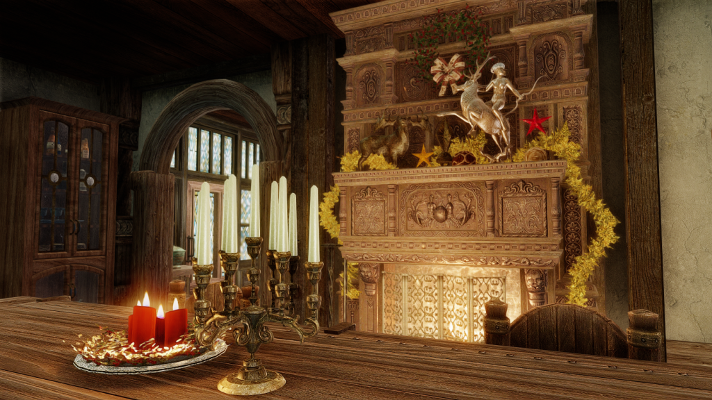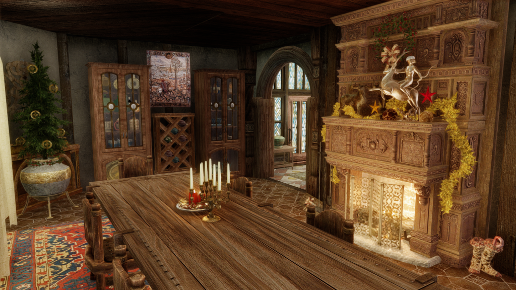 季節の飾り付けをしたり、「Seasons of Skyrim SKSE」を導入して撮ったものも混ぜています。Seasons~は撮影中に初めて導入してみましたが、個人的には木々の色めきが綺麗な秋バージョンが特に良かったです。