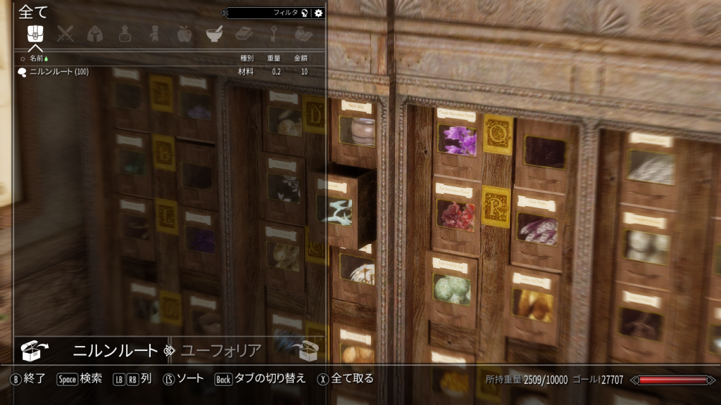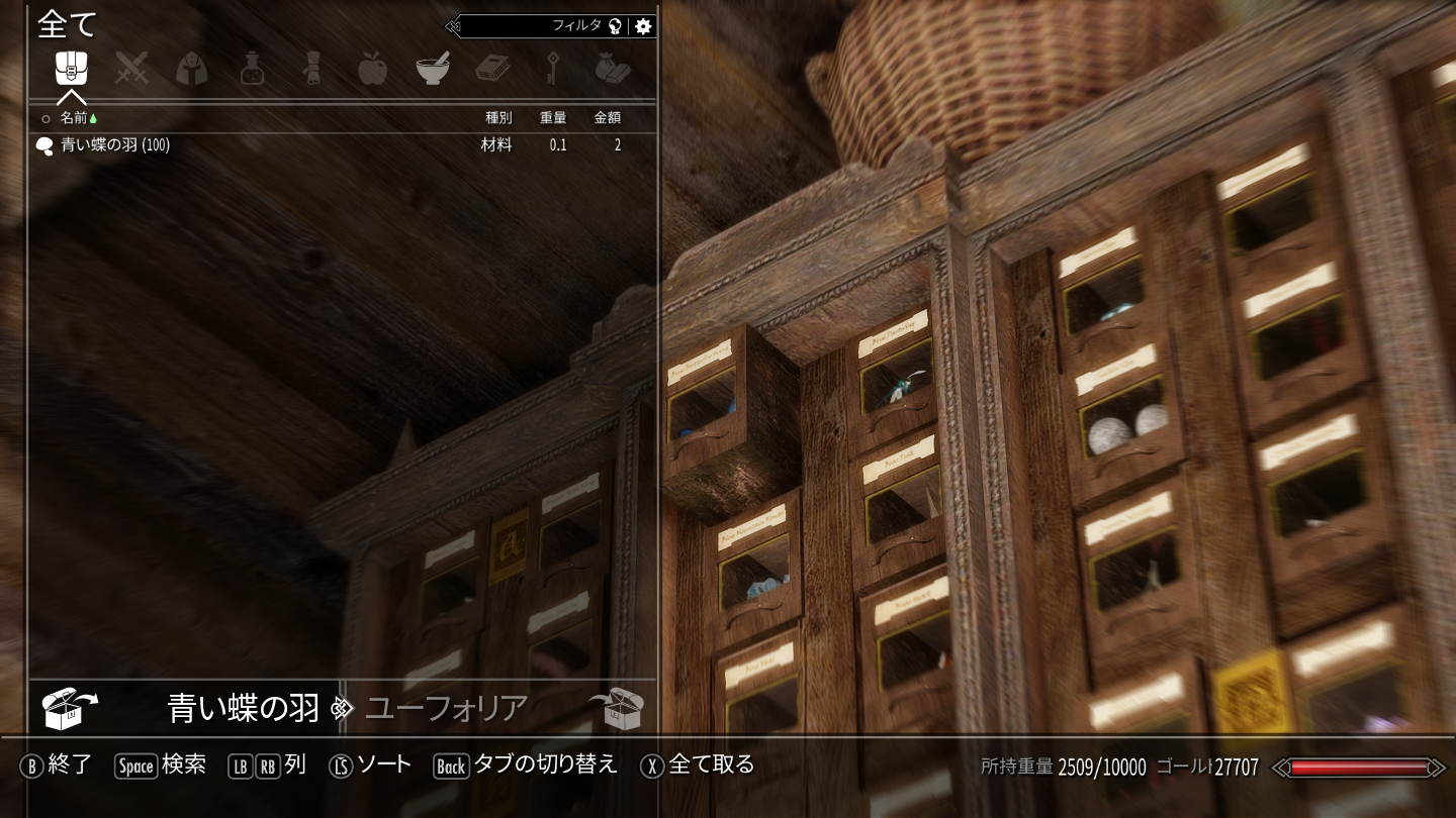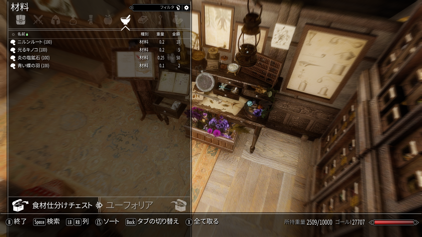 ニルンルートや青い蝶の羽根など、試しにいくつかの錬金素材をチェストから右の棚に収納してみました。素材が見えるタイプの引き出しになっており、取り出す際に便利です。