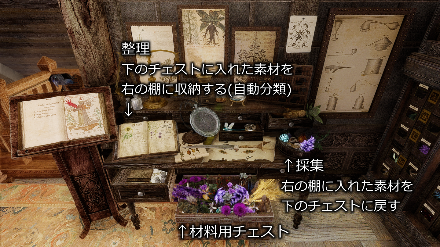 机の下にのチェストに入れた錬金素材を自動分類(収納)したり、棚に収納した素材をチェストに戻したりできます。