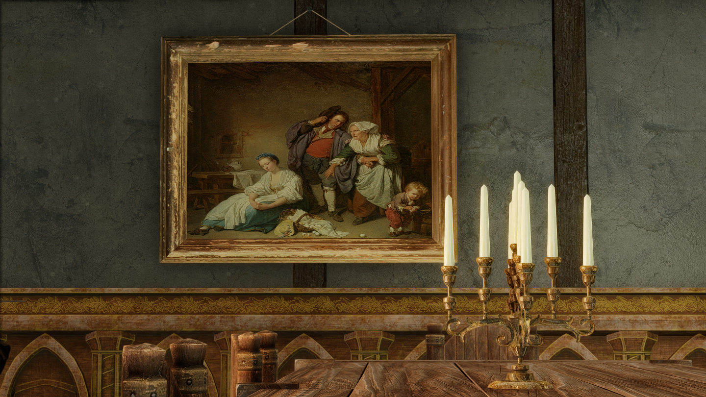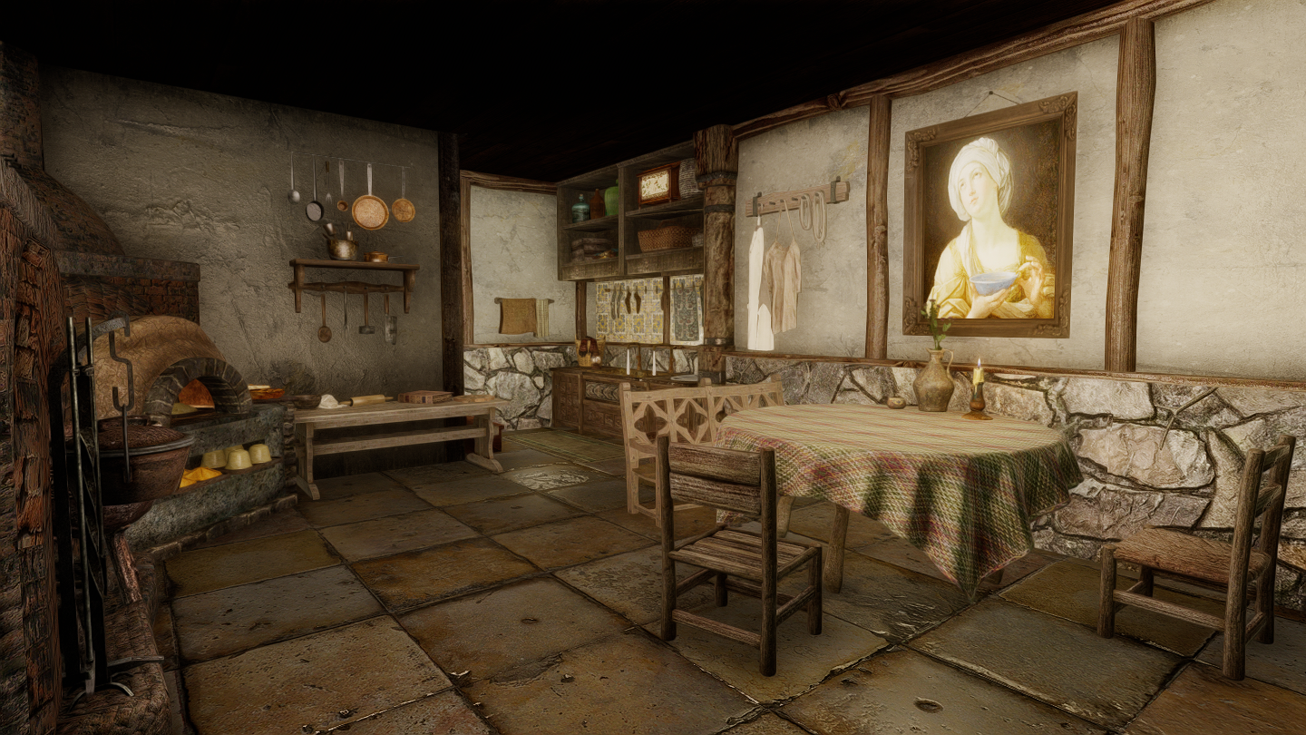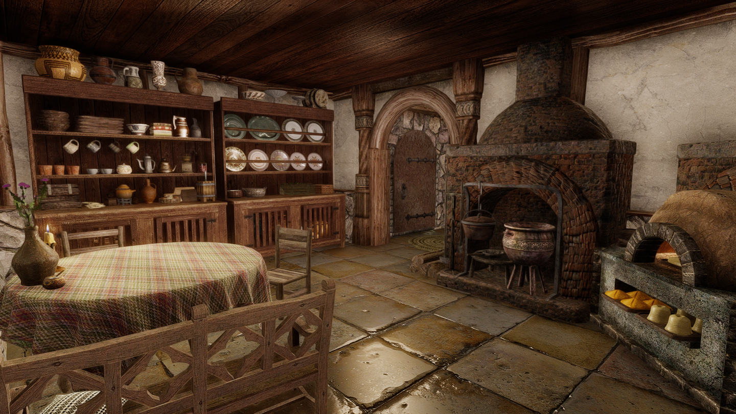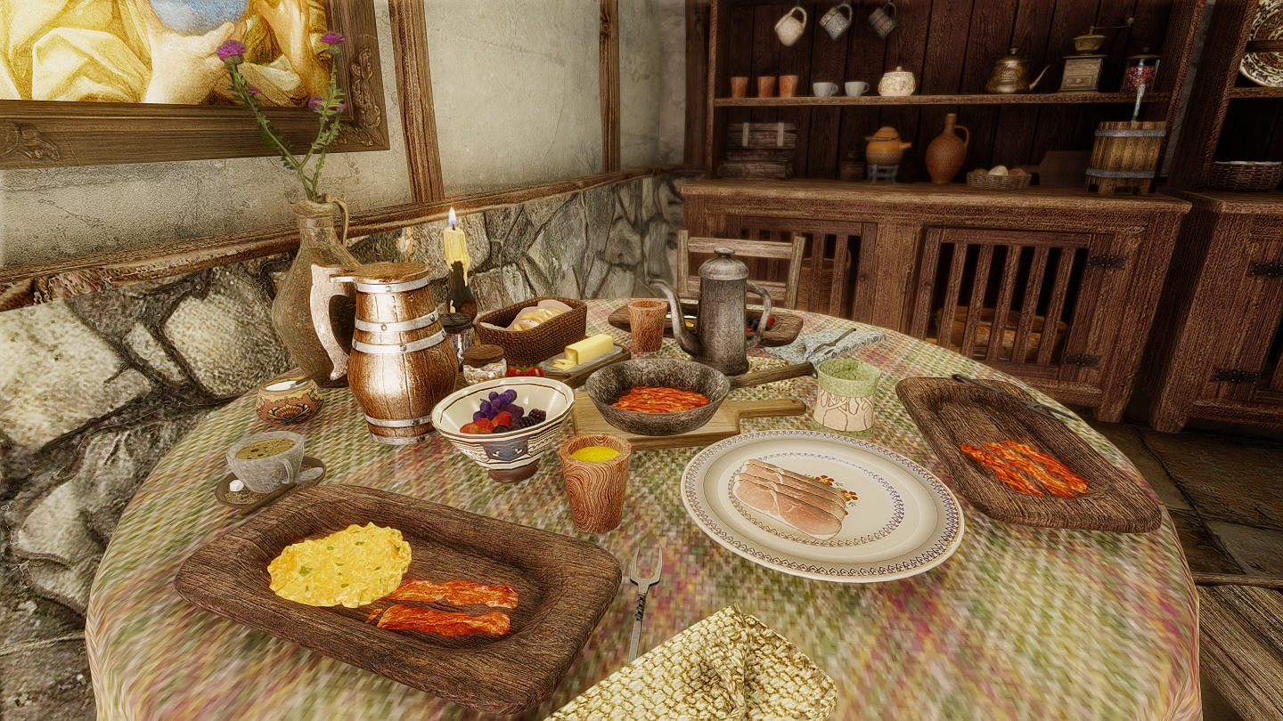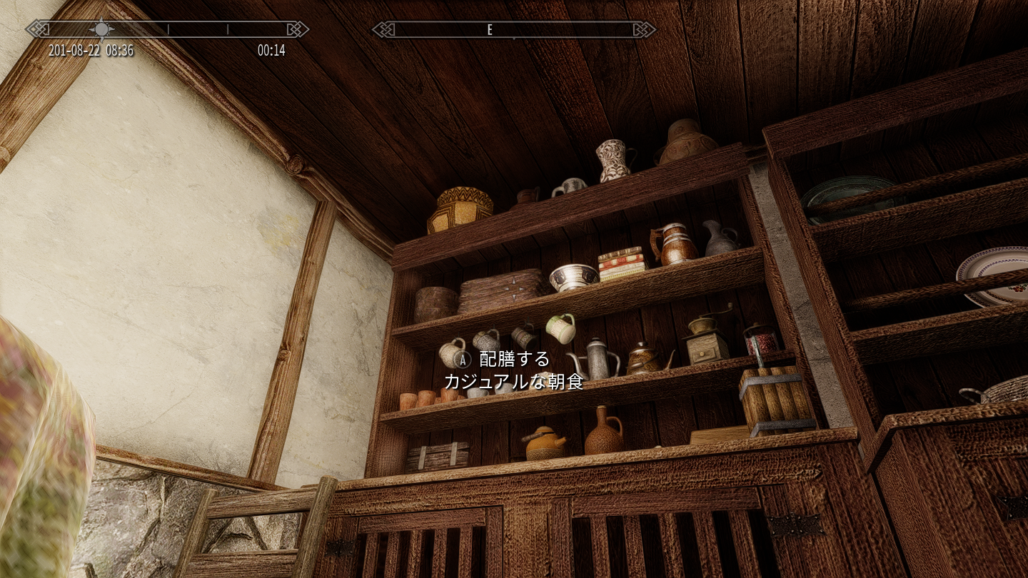 食器棚の左側をアクティベートすることで、後ろにあるテーブルに朝食が用意されます。テーブル手前にある皿をアクティベートすると片付けられます。